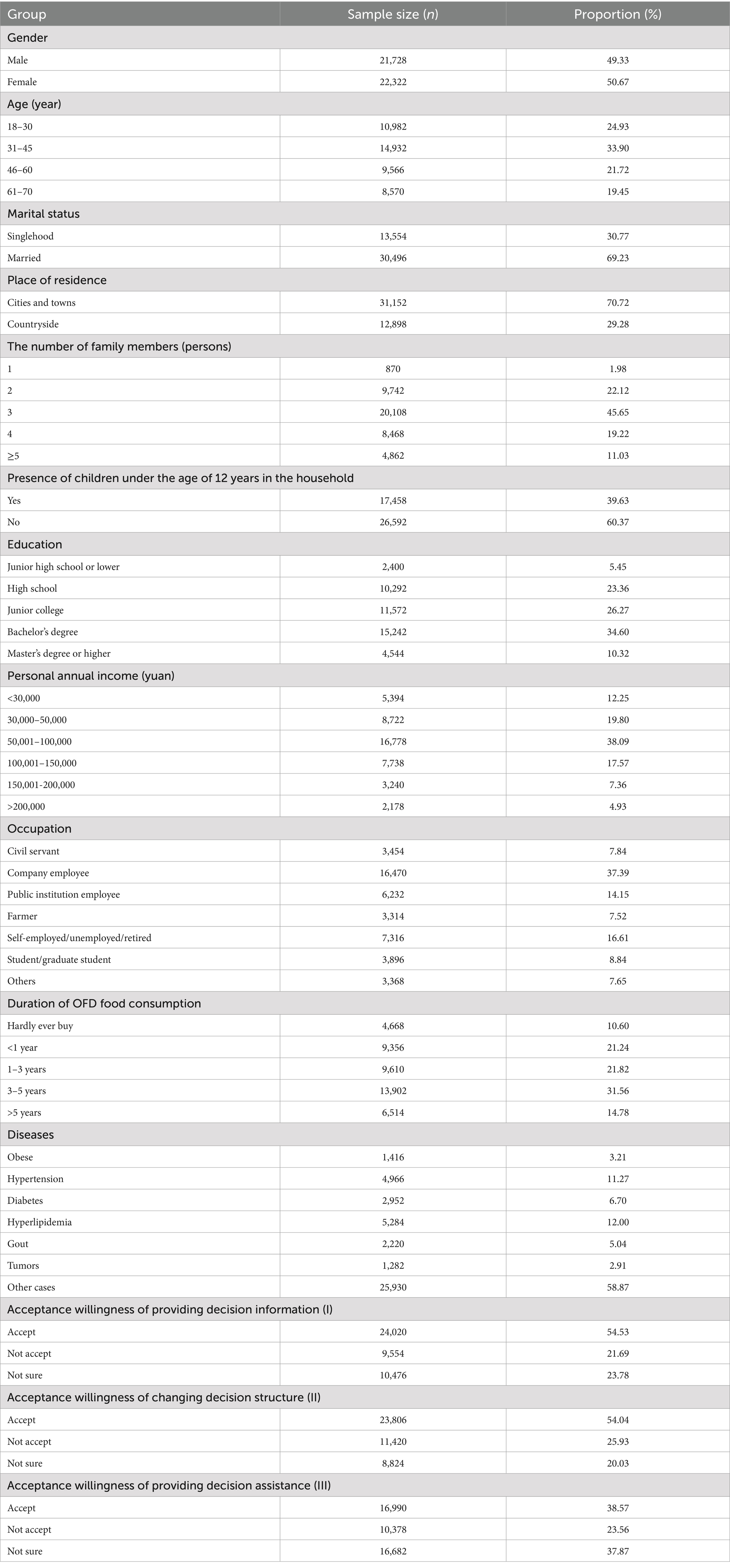 Except for a few multiple-choice questions, most of the survey questions are multiple-choice questions, and uncertainty options are set in the answers of each question item to ensure that the real physical condition of the respondents’ consumption and self-assessment is known. The important concepts involved in the questionnaire (e.g., “nutrition label,” “tumor” type, “blood lipid” normal range values, etc.) are specifically explained in the questionnaire. The samples were collected from May 01 to June 30, 2023. The subjects of this paper must be consumers who have their own experience of eating online food and beverages. After removing the samples that did not meet the basic criteria of the respondents, a total of 44,050 valid samples were collected.