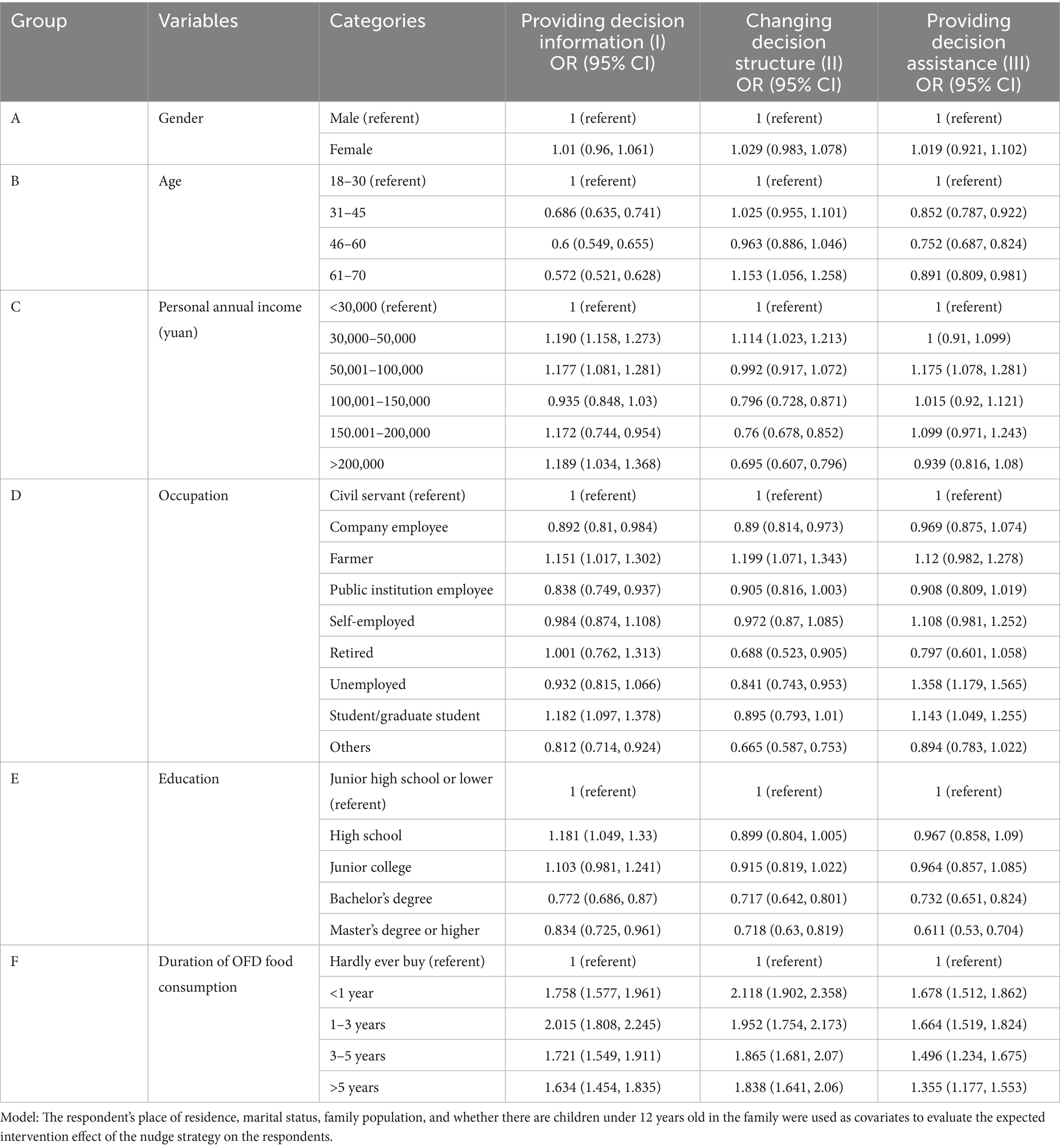 Table 4 summarizes the possible impacts of different categories of nudging strategies on different types of respondents. It can be found that compared with male respondents, female respondents have a higher willingness to accept nudging strategies. The data show that women are 1.01 (95%CI 0.96 to 1.061), 1.029 (95%CI 0.983 to 1.078), and 1.019 times (95%CI 0.921 to 1.102) of male respondents, that is, they are more susceptible to nudging strategies to make healthy catering food choices. The basic characteristic of “age” also significantly affects the intervention effect of nudging strategies on respondents. Respondents aged 18–30 are more likely to accept type I and type III nudging strategies than those aged 30. For example, respondents aged 31–45 are 0.686 times more likely to be affected by type I nudging strategies than consumers aged 18–30 (95%CI 0.635 to 0.741). In particular, the older respondents are less likely to be willing to accept Type I, that is, they are less willing to choose healthy catering foods by analyzing the information on the food nutritional content tip label. For example, respondents aged 61–70 are only 0.572 times more likely to be affected by Type I nudging strategies than those aged 18–30 (95%CI 0.521 to 0.628). Mazza et al. (44) studied the utility of nutritional information labels. They found that traffic light labels containing calorie information affect consumers’ purchasing strength for high-calorie foods. Based on this research results, this paper further found that the lower the age respondents are more susceptible to the promotion strategies for providing decision-making information (44).