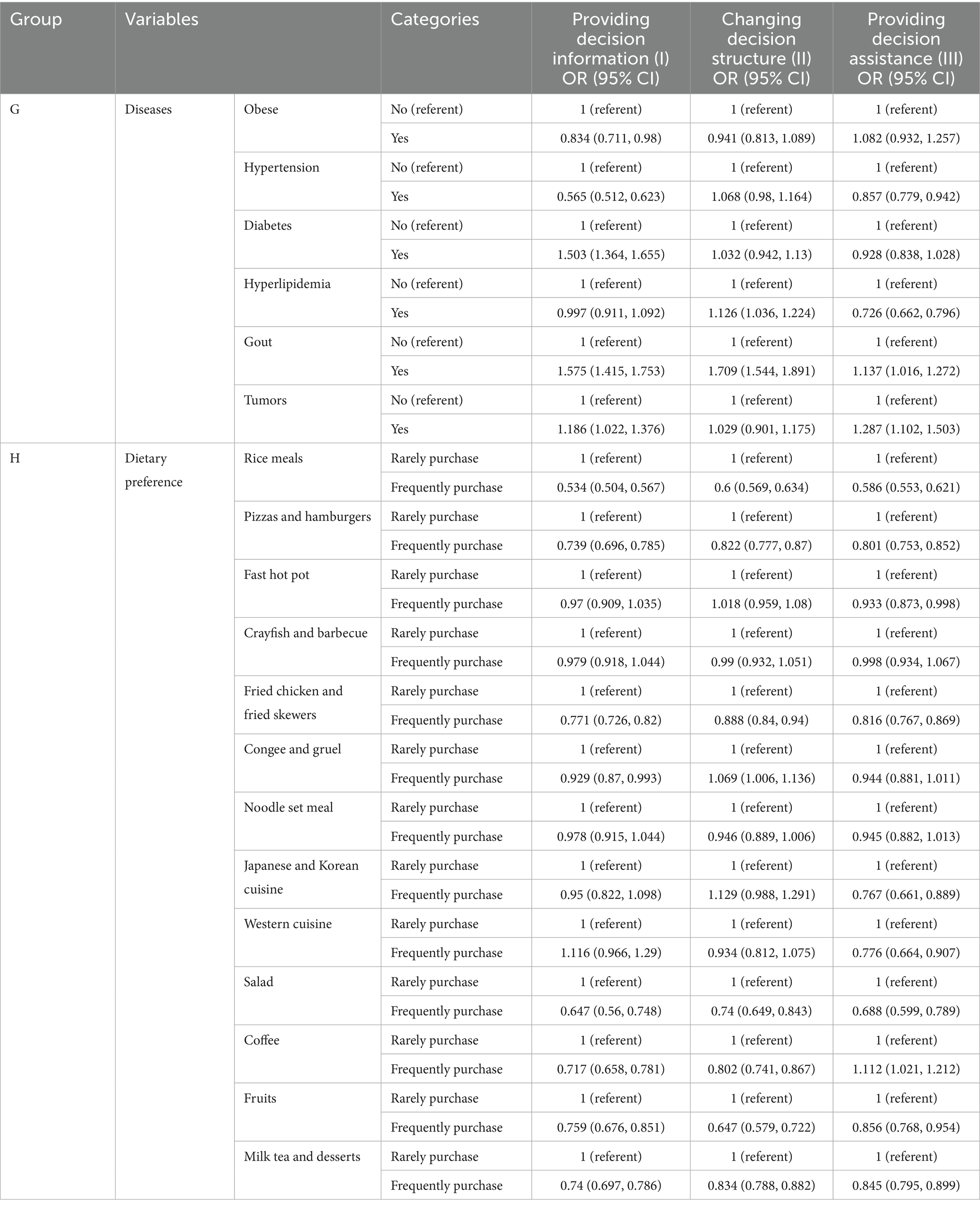 Based on the rapid development of the online catering industry and China has the world’s largest online catering market (1), combined with the objective reality of the unreasonable dietary structure of online catering foods (21), and considering that unhealthy diets are very likely to cause chronic diseases such as obesity, hypertension, hyperlipidemia, diabetes, etc., it has become an important risk factor affecting the health of residents around the world (22). It can be seen that consumers’ online catering dietary choices have become particularly important, and it is urgent to conduct research focusing on interfering with consumers’ healthy dietary behaviors. Based on this, this paper fully considers the characteristics of online catering consumer groups, aiming to formulate different nudging strategies based on the common characteristics of different subdivided populations. By collecting survey data on the willingness of online catering consumers in China to accept the nudging strategies, the research method of multiple logistic regression model is adopted to explore the different expected intervention effects of three types of nudging strategies, such as providing decision information, changing decision structure, and providing decision assistance, on different types of consumers.