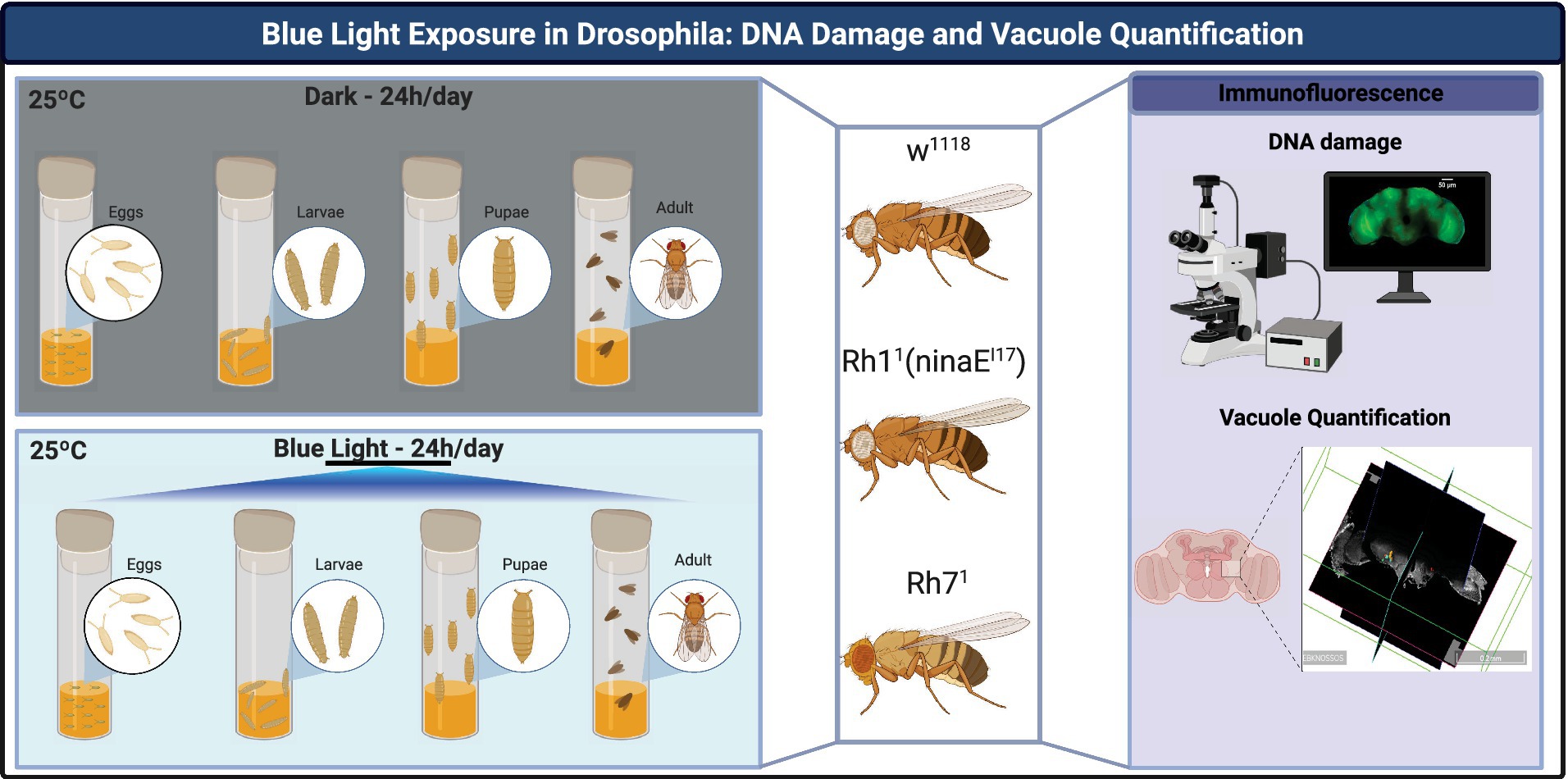 Figure 1. Experimental workflow of blue-light exposure and analysis in Drosophila melanogaster. Flies [w1118, Rh11 (ninaEI17), and Rh71] were reared at 25 °C and 70% relative humidity under either constant darkness or continuous blue light exposure (488 nm, 1,320 lux, 1,120 μW cm−2). Development from egg to adult occurred entirely under the assigned condition. Adult flies were analyzed at 20 days post-eclosion. Experimental outcomes included: (i) immunofluorescence staining to detect DNA damage (γ-H2Av, red), nuclei (Hoechst, blue), and actin fibers (Phalloidin, green); and (ii) volumetric quantification of brain vacuoles using 3D reconstruction software. Created with BioRender https://biorender.com/b4wjkjn.