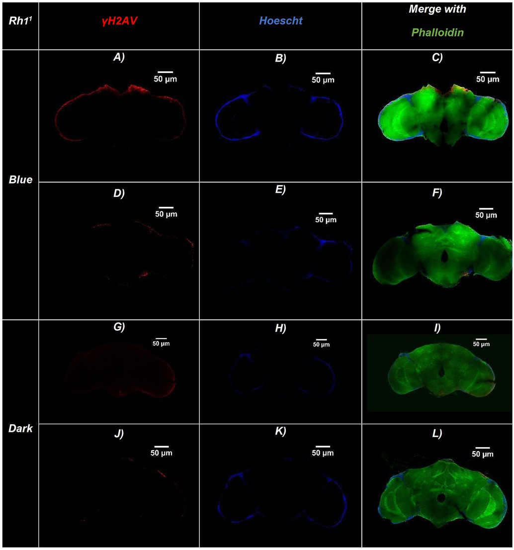 Figure 2. Representative confocal images of adult Drosophila Rh11 (ninaE17) brains exposed to blue light or maintained in darkness. Brains were immunostained for DNA damage (γ-H2Av, red), nuclei (Hoechst, blue), and actin filaments (Phalloidin, green). (A–F) Brains exposed to continuous blue light (24 h/day for 20 days)—(A,D) γ-H2Av channel, (B,E) Hoechst channel, (C,F) Merged. (G–L) Brains maintained in constant darkness (24 h D/D): (G,J) γ-H2Av channel, (H,K) Hoechst channel, (I,L) Merged. Merged panels (C,F,I,L) show colocalization of all three markers, allowing visualization of brain structure and DNA damage. Brains exposed to blue light display a higher number of γ-H2Av–positive nuclei (red), indicating increased DNA damage compared to dark controls. Scale bars: 50 μm (all panels).