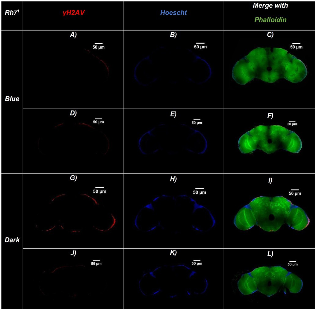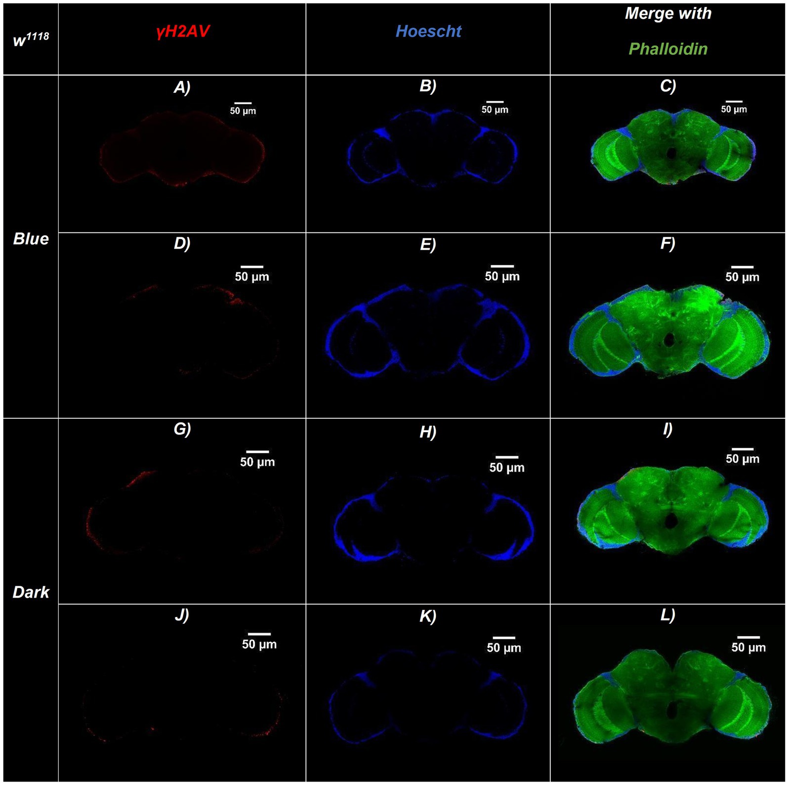 Figure 3. Representative confocal sections of adult Drosophila Rh71 brains under blue-light or dark conditions. Brains were immunostained for DNA damage (γ-H2Av, red), nuclei (Hoechst, blue), and actin filaments (Phalloidin, green). (A–F) Brains exposed to continuous blue light (24 h/day for 20 days)—(A,D) γ-H2Av channel, (B,E) Hoechst channel, (C,F) Merged. (G–L) Brains maintained in constant darkness (24 h D/D): (G,J) γ-H2Av channel, (H,K) Hoechst channel, (I,L) Merged. Merged panels (C,F,I,L) show colocalization of all three markers, allowing visualization of brain structure and DNA damage. Brains exposed to blue light display a higher number of γ-H2Av–positive nuclei (red), indicating increased DNA damage compared to dark controls. Scale bars: 50 μm (all panels).