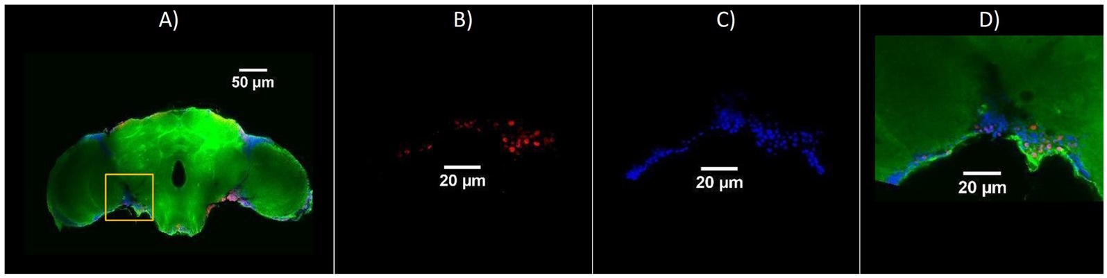 Figure 5. Representative confocal images showing the region of interest used for quantification of cellular staining in adult Drosophila brains. (A) Overview of a brain section with merged channels: γ-H2Av (red), Hoechst (blue), and Phalloidin (green); the yellow box indicates the region selected for analysis. Amplified views of the selected region—(B) γ-H2Av-positive cells (red, DNA damage), (C) Hoechst-stained nuclei (blue), (D) Merged image including Phalloidin (green), showing colocalization of nuclear and cytoskeletal markers with γ-H2Av signal. Scale bars: 50 μm (A), 20 μm (B–D).