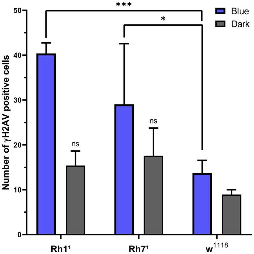 Figure 6. Proportion of γH2Av-positive cells in Drosophila brains under blue-light or dark conditions across genotypes (w1118, Rh11, Rh71). Values are expressed as mean ± SD. Statistical significance was determined by two-way ANOVA followed by Tukey’s multiple comparisons test (n = 3 brains per group). Under blue light, Rh11 showed a significant increase in γ-H2Av–positive cells compared with w1118 (***p < 0.001), and Rh71 also differed from w1118 (*p < 0.05). Only Rh11 showed a significant difference between blue-light and dark conditions (***p < 0.001). ns = non-significant.