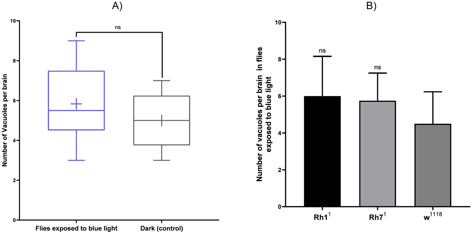 Figure 8. Quantification of brain vacuoles in Drosophila after continuous blue-light exposure (24 h/day, 20 days) compared with constant dark controls (24 h D/D). (A) Number of vacuoles per brain in flies exposed to blue light versus dark controls. (B) Comparison across genotypes (Rh11, Rh71, and w1118) under blue-light exposure. Values are expressed as mean ± SD (n = 3 brains per group). Statistical analysis was performed using the Mann–Whitney test for blue light versus dark (ns, p = 0.59) and Kruskal–Wallis followed by Dunn’s multiple comparisons test across genotypes (ns, p = 0.48). No significant differences were detected (ns).