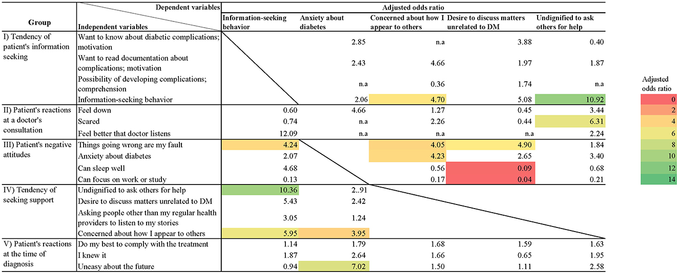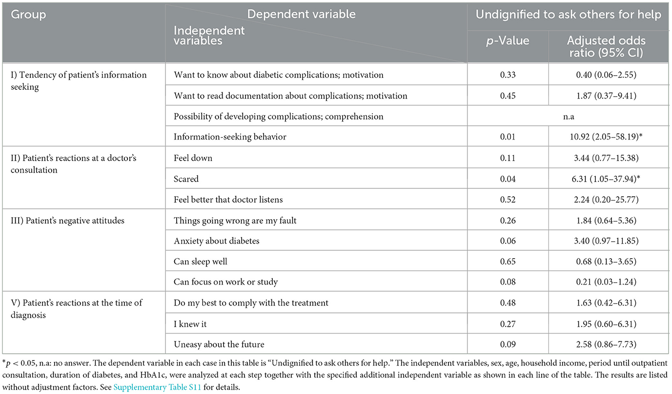 Supplementary Table S11 | Relationship between patient's “undignified to ask others for help” and other attitudes. *p < 0.05, n.a: no answer. The dependent variable in each case in this table is “Undignified to ask others for help.” The independent variables, sex, age, household income, period until outpatient consultation, duration of diabetes, and HbA1c, were analyzed at each step together with the specified additional independent variable as shown in each line of the table.