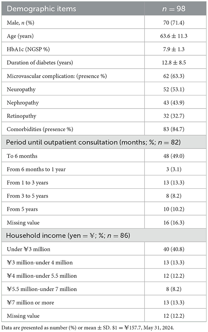 Of the 121 questionnaires distributed, 119 (98.3%) responses were obtained, of which 98 (81.0%) were valid. Of the 21 adults with DM who were excluded, 19 had diseases other than T2DM (5 gestational DM, 10 type 1 DM, and 4 with other diseases), one was pregnant, and one patient had an HbA1c value that was not useful as an indicator due to comorbidity. The mean age of the participants (n = 98) was 63.6 ± 11.3 (range 32–83) years, and there were 70 men (71.4%) and 28 women (28.6%). The mean HbA1c (National Glycohemoglobin Standardization Program: NGSP) value was 7.9 ± 1.3% (5.6%−12.1%), and the mean duration of T2DM disease was 12.8 ± 8.5 years. Regarding the time it took to see a doctor for T2DM, about half of the respondents visited a medical institution within 6 months, and 10% took more than 5 years (Table 1).