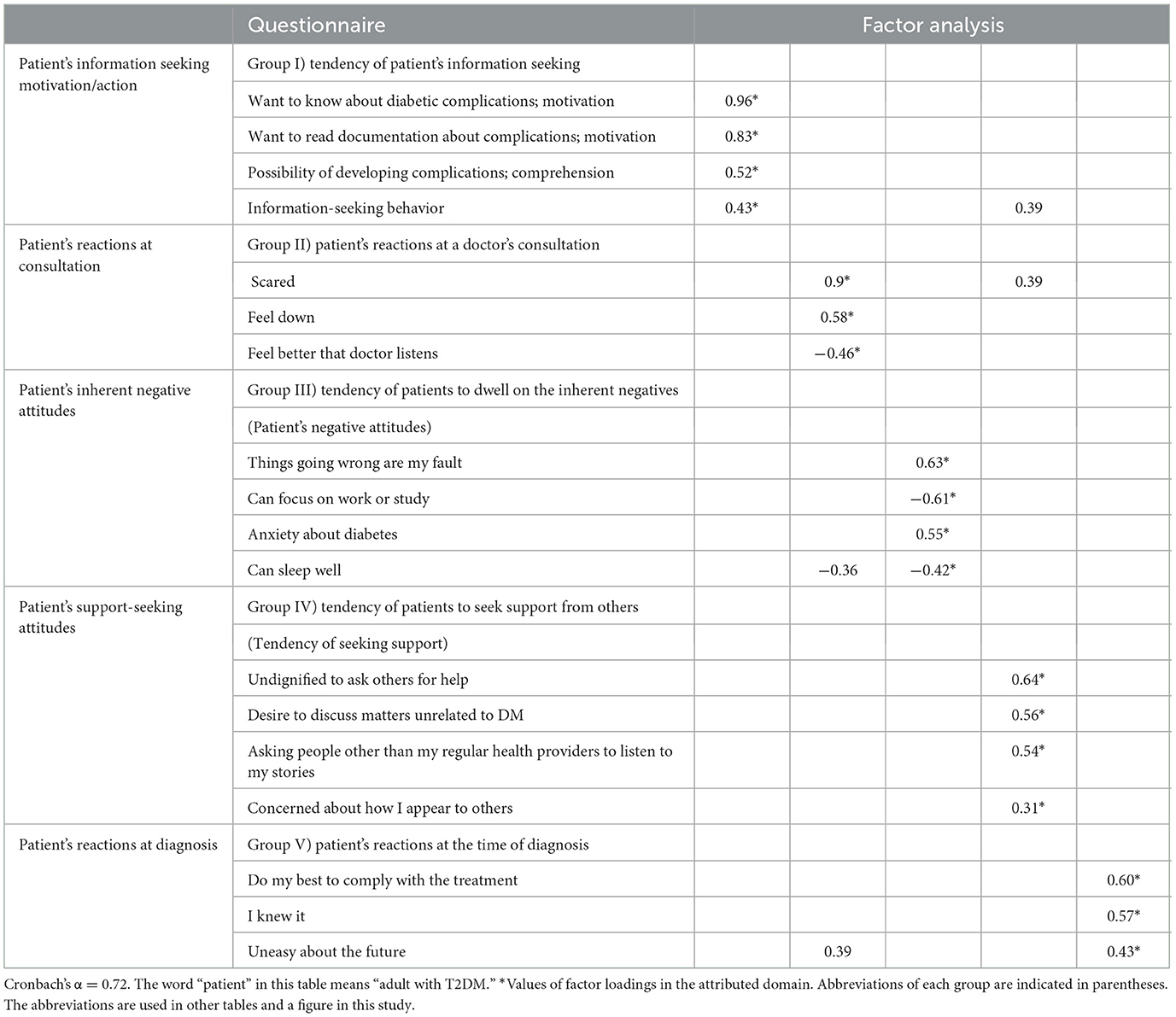 Furthermore, adults with T2DM who are concerned about how they appear to others tend to worry greatly and avoid social interaction because of a fear of embarrassing themselves. These attitudes can potentially lead to the patient not asking for help, which influences their treatment and attitudes toward treatment (37). To address this, question items for “Patient's support-seeking attitudes,” such as being able to ask for help and to listen to them, feeling it is undignified to ask others for help, and being concerned about how they appear to others were created (Supplementary Table S1). Additionally, a question about the desire to discuss matters unrelated to DM at consultations was included in this group. Those who chat freely at a consultation but not so much about their treatment might be reluctant to accept their DM and/or its treatment or try to avoid any task which a patient should be able to tackle without asking for help from others (38).