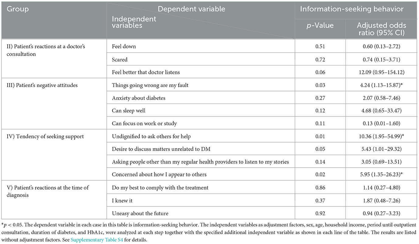 Supplementary Table S4 | Relationship between patient's information-seeking behavior and patient's attitudes. *p < 0.05. The dependent variable in each case in this table is information-seeking behavior. The independent variables, sex, age, household income, period until outpatient consultation, duration of diabetes, and HbA1c, were analyzed at each step together with the specified additional independent variable as shown in each line of the table.
