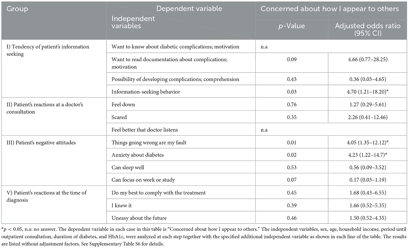 Supplementary Table S6 | Relationship between “Concerned about how I appear to others” and patient's other attitudes. *p < 0.05, n.a: no answer. The dependent variable in each case in this table is “Concerned about how I appear to others.” The independent variables, sex, age, household income, period until outpatient consultation, duration of diabetes, and HbA1c, were analyzed at each step together with the specified additional independent variable as shown in each line of the table.