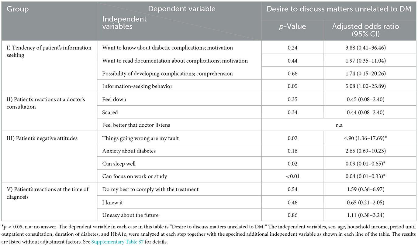 Supplementary Table S7 | Relationship between patient's desire to discuss matters unrelated to DM and other attitudes. *p < 0.05, n.a: no answer. The dependent variable in each case in this table is “Desire to discuss matters unrelated to DM.” The independent variables, sex, age, household income, period until outpatient consultation, duration of diabetes, and HbA1c, were analyzed at each step together with the specified additional independent variable as shown in each line of the table.