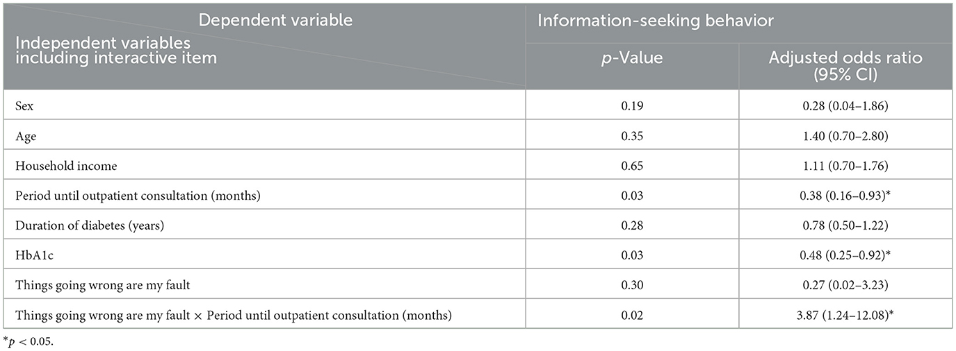 In the analysis including interactions, those who waited a long time before consultation and respondents with high HbA1c values were significantly not engaging in information-seeking behavior (p = 0.03, p = 0.03, respectively; Table 6). However, respondents who thought it was their fault that things went wrong and took a long time to see a doctor were significantly more likely to seek information (p = 0.02; Table 6, Supplementary Figure S3). Respondents who felt that it was undignified to ask others for help and had anxiety about diabetes, as well as those who felt concerned about how they appeared to others and had anxiety about diabetes showed a significantly stronger tendency to engage in information-seeking behavior (p = 0.02, p = 0.02, respectively; Supplementary Tables S8, S9).