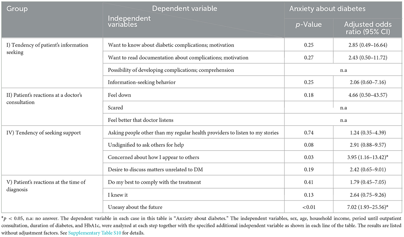 Supplementary Table S10 | Relationship between patient's anxiety about diabetes and other attitudes. *p < 0.05, n.a: no answer. The dependent variable in each case in this table is “Anxiety about diabetes.” The independent variables, sex, age, household income, period until outpatient consultation, duration of diabetes, and HbA1c, were analyzed at each step together with the specified additional independent variable as shown in each line of the table.