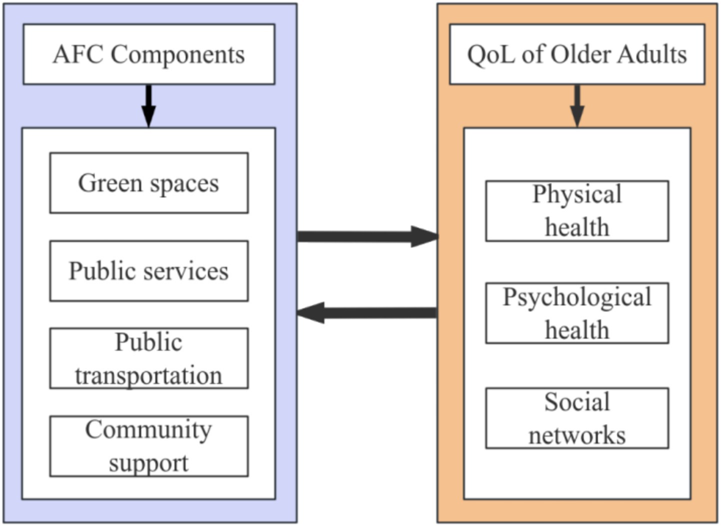 Previous studies have examined the relationships between several AFC components and the QoL of older adults. Green spaces enhance the happiness and community identity of the older adult by optimizing the community environment (37). Public healthcare services directly affects community satisfaction (38). The accessibility of public transportation can alleviate depressive symptoms and contribute to improved social participation among the older adult (21). Community support effectively reduces feelings of loneliness and enhances life satisfaction by strengthening social activities and services (39). However, there is limited research on the comprehensive impact of AFC systems on various aspects of older adults’ QoL. In fact, AFCs are comprehensive systems with different elements, such as green spaces, community support, healthcare, and so on. Therefore, it is important to consider AFCs as a whole and to systematically evaluate the different components of AFCs to explore their multifaceted effects on older adults’ QoL. The conceptual model for this study is depicted in Figure 1.