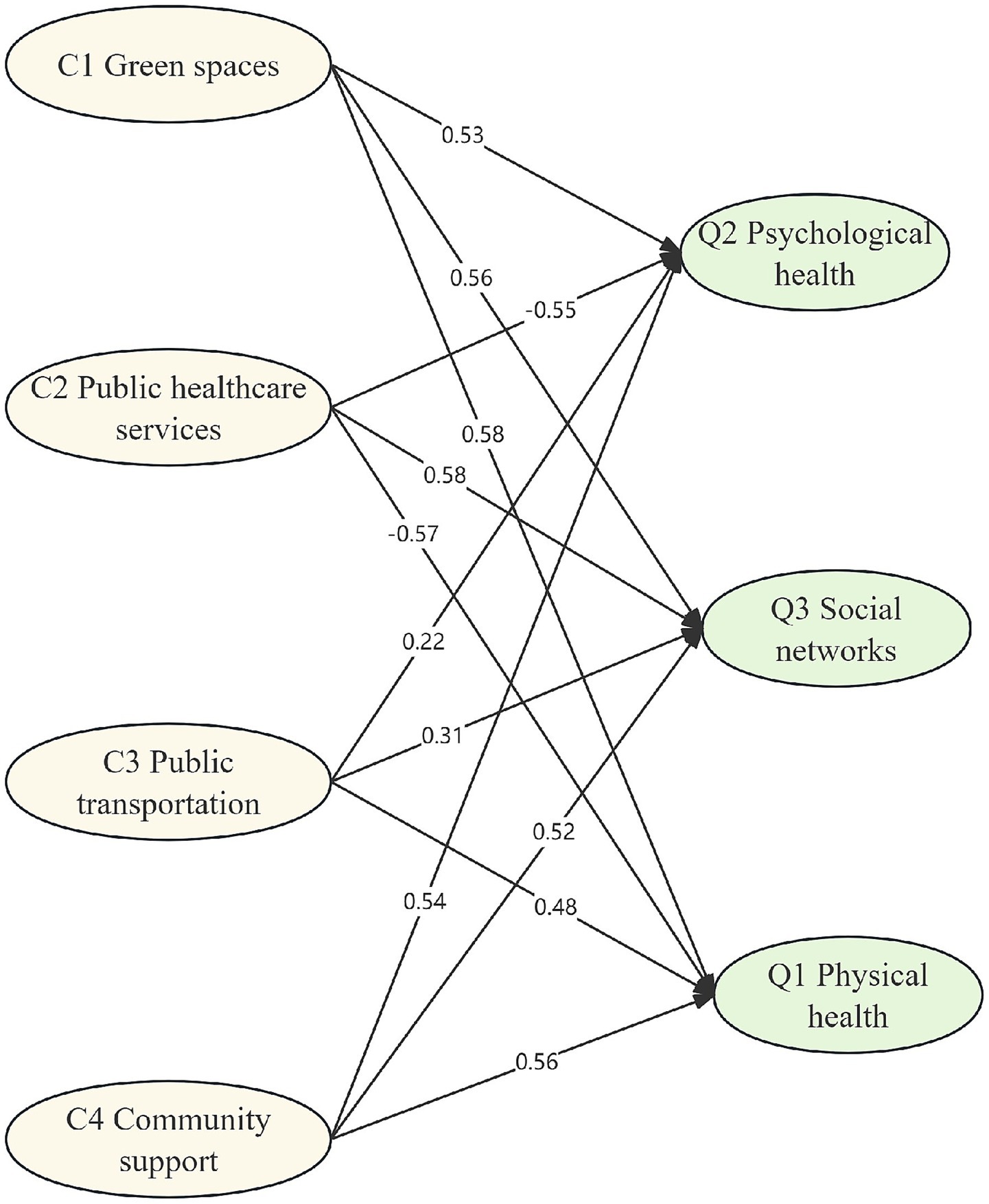 The measurement model was first evaluated using confirmatory factor analysis to verify the relationships between the latent constructs and their observed indicators. The standardized factor loadings of each indicator are presented in Table 5. The paths among the AFC and QoL factors in the structural model are shown in Figure 2. The hypothesized model was tested and subsequently refined to improve model fit. The results revealed that this final model had the lowest badness-of-fit indices (RMSEA: 0.073) and the highest overall fit indices (CFI: 0.883, NFI: 0.831, IFI: 0.894, NNFI: 0.819) (43). The paths of the SEM indicated the following: (1) green spaces (C1) positively influenced physical health (Q1), psychological health (Q2) and social networks (Q3); (2) public healthcare services (C2) negatively affected physical health (Q1) and psychological health (Q2); (3) the relationships between public transportation (C3) and the QoL factors were not significant; and (4) community support (C4) impacted psychological health (Q2) and social networks (Q3) positively.