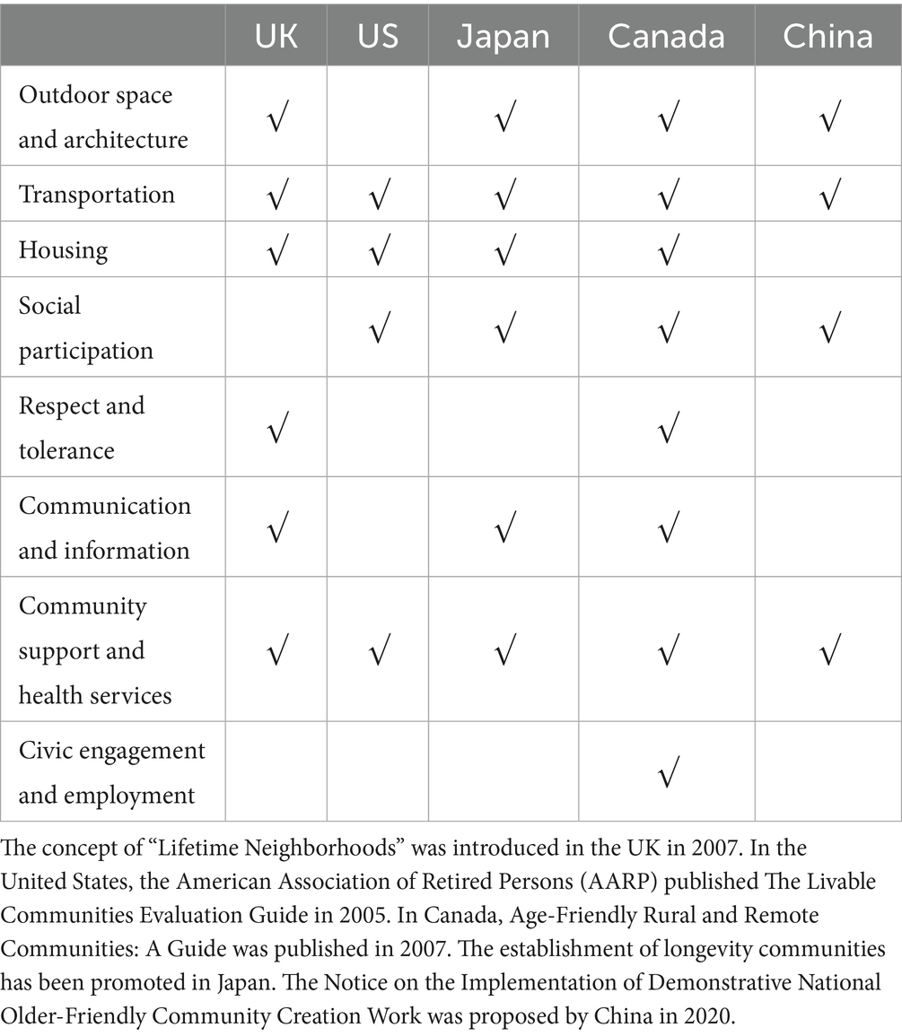 With the acceleration of global aging, many countries and regions have begun practicing AFC construction, their efforts resulting in certain achievements. In the United Kingdom, London adopts an inclusive design strategy to ensure a friendly environment for older people, while Manchester, the first city in the UK to join the WHO Global Network of AFCs, encourages retrofitting housing and public places through policymaking and funding support (13). The United States provides policy and regulatory support for developing AFCs while encouraging research institutions and enterprises to develop specialized products that meet older people’s special needs (14). Japan focuses on using smart devices, such as smart home systems and wearable health monitoring devices, to protect older people’s safety while also establishing community safety networks to ensure their living security (15). Japan is the country in Asia that entered the aging society stage earliest. It has been promoting the construction of ‘longevity communities’ and advocating for the establishment of a comprehensive older adult care model that combines healthcare and nursing services within large community settings (16). Although different countries have different focuses with regard to AFCs, they all aim to improve older people’s QoL in various ways. Table 1 shows the emphasis of AFC construction in five countries.