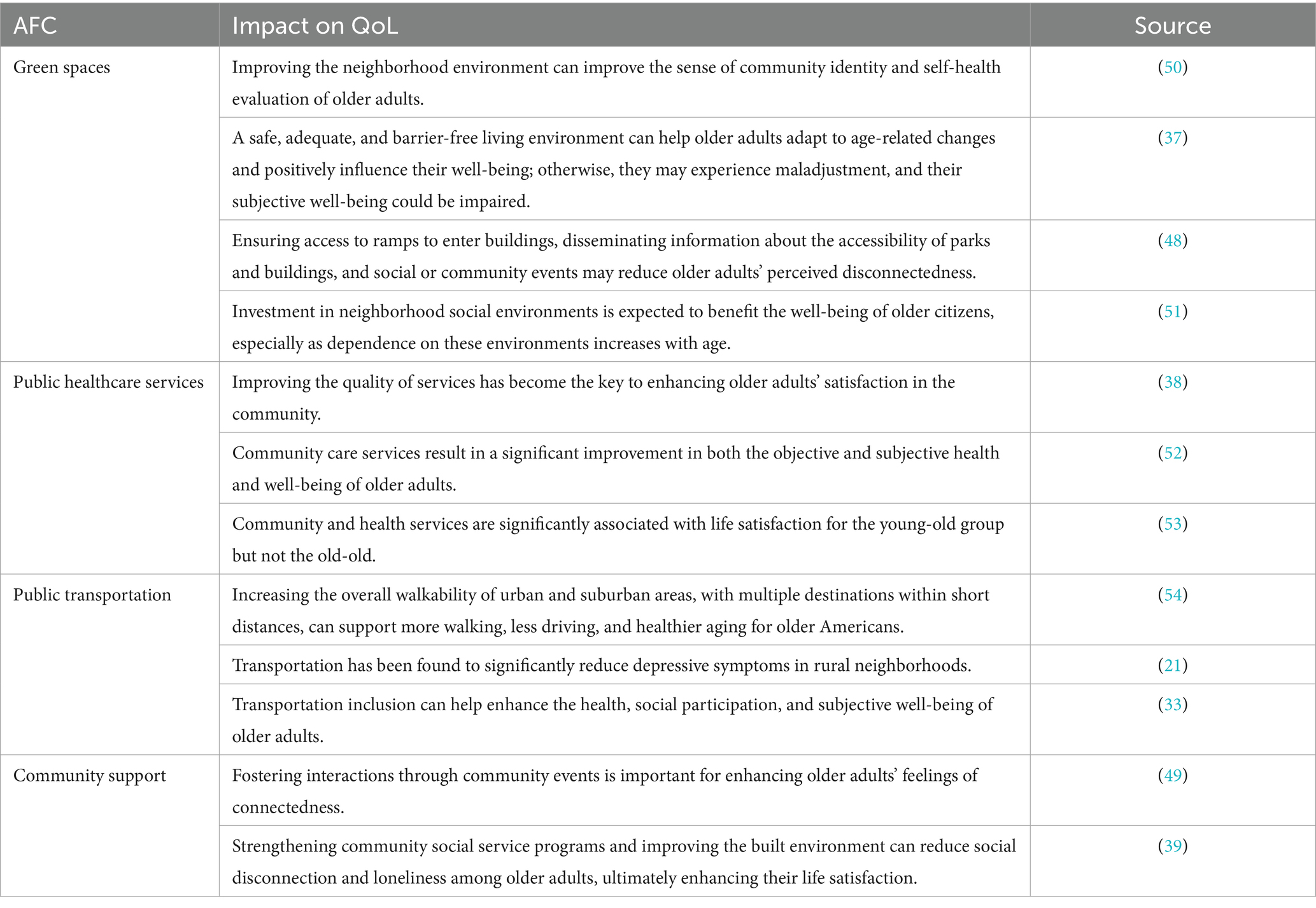 Community support is particularly important in enhancing the overall QoL of older adults (34). Moreover, such support can enhance older adults’ satisfaction with their lives (35). Dikken et al. (36) developed a specific questionnaire to gain a better understanding of older individuals’ experiences regarding the age-friendliness of cities. The composition of AFCs is therefore assumed to determine the QoL of older individuals. Previous studies on the impact of AFCs on QoL factors are summarized in Table 2.