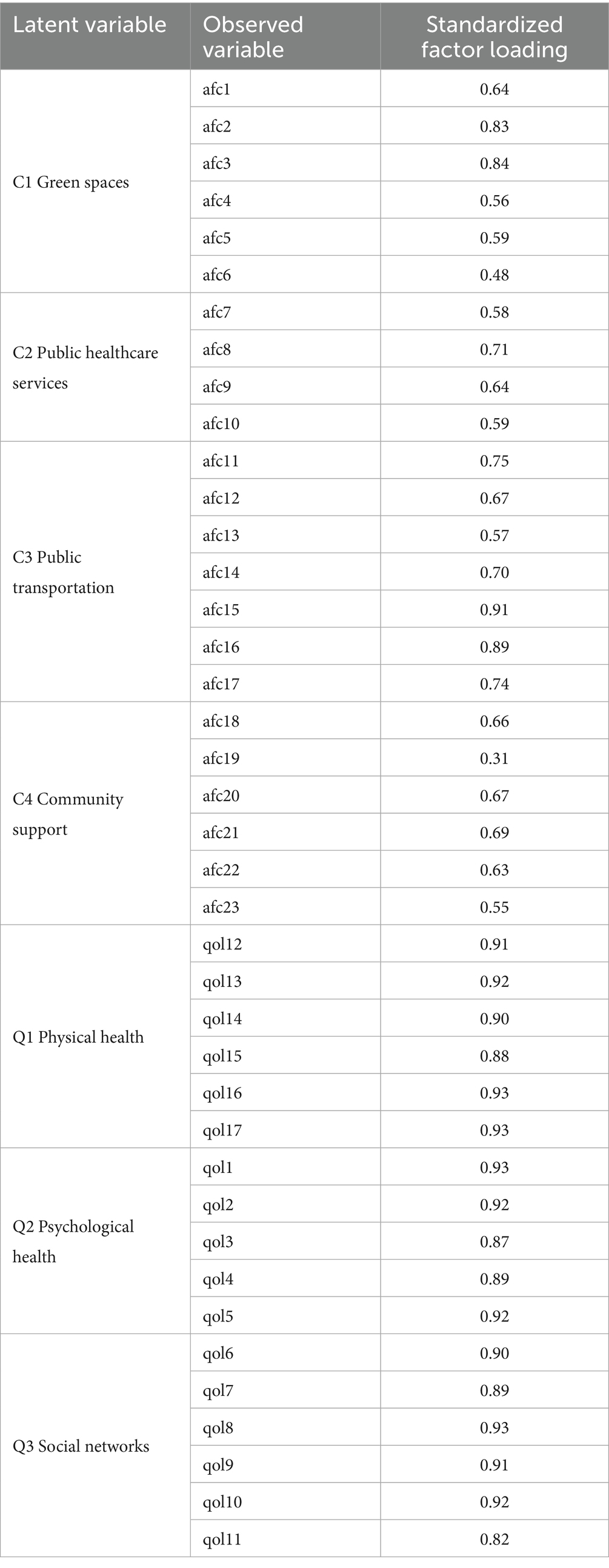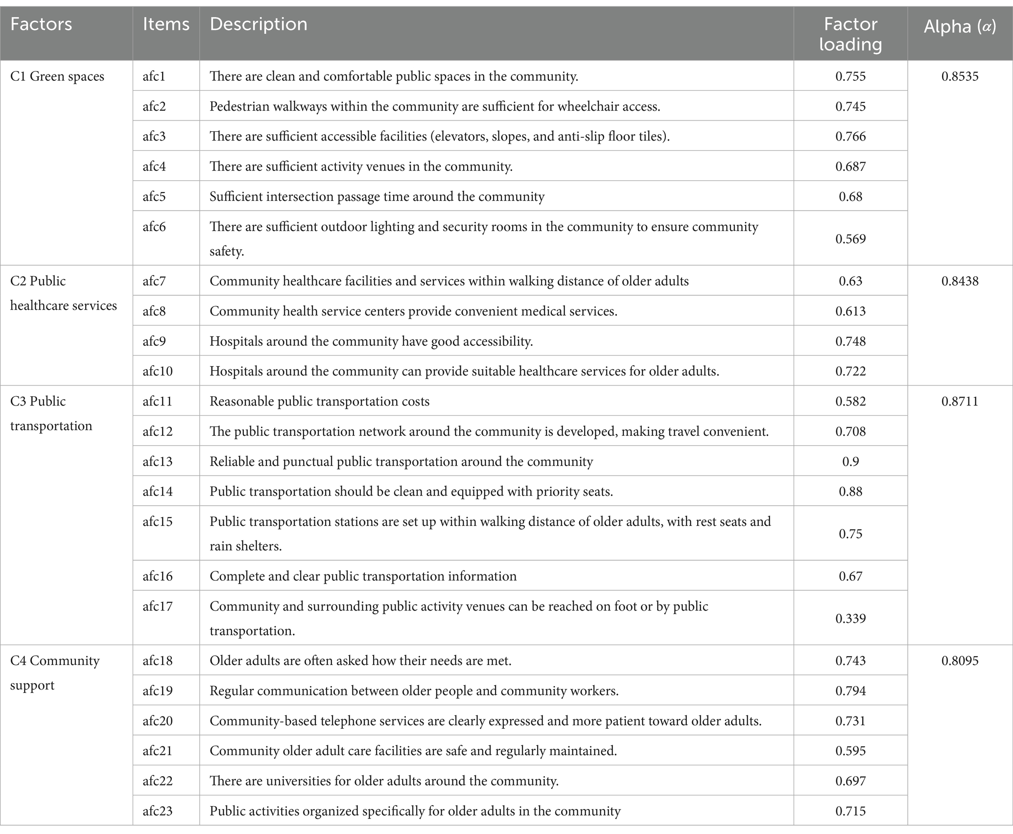 The four AFC components [i.e., green spaces (C1), public healthcare services (C2), public transportation (C3), and community support (C4)] had coefficient alphas ranging from 0.809 to 0.885. Apart from item afc17, all items were appropriately loaded into acceptable factors. Item afc17 was removed from public transportation (C3) due to its low factor loading of 0.339. Reliability testing showed a significant improvement in the Cronbach’s alpha value for public transportation (C3) after removing item afc17. As older adults in China age, their physical functions gradually decline and long walks or using public transportation may impose additional burdens on their bodies. Considering safety, older adults prefer to engage in daily activities near their homes or within the community. Additionally, the social circles of older adults are relatively small and mainly concentrated in the community and nearby areas, which also makes them more inclined to participate in activities in these familiar places.