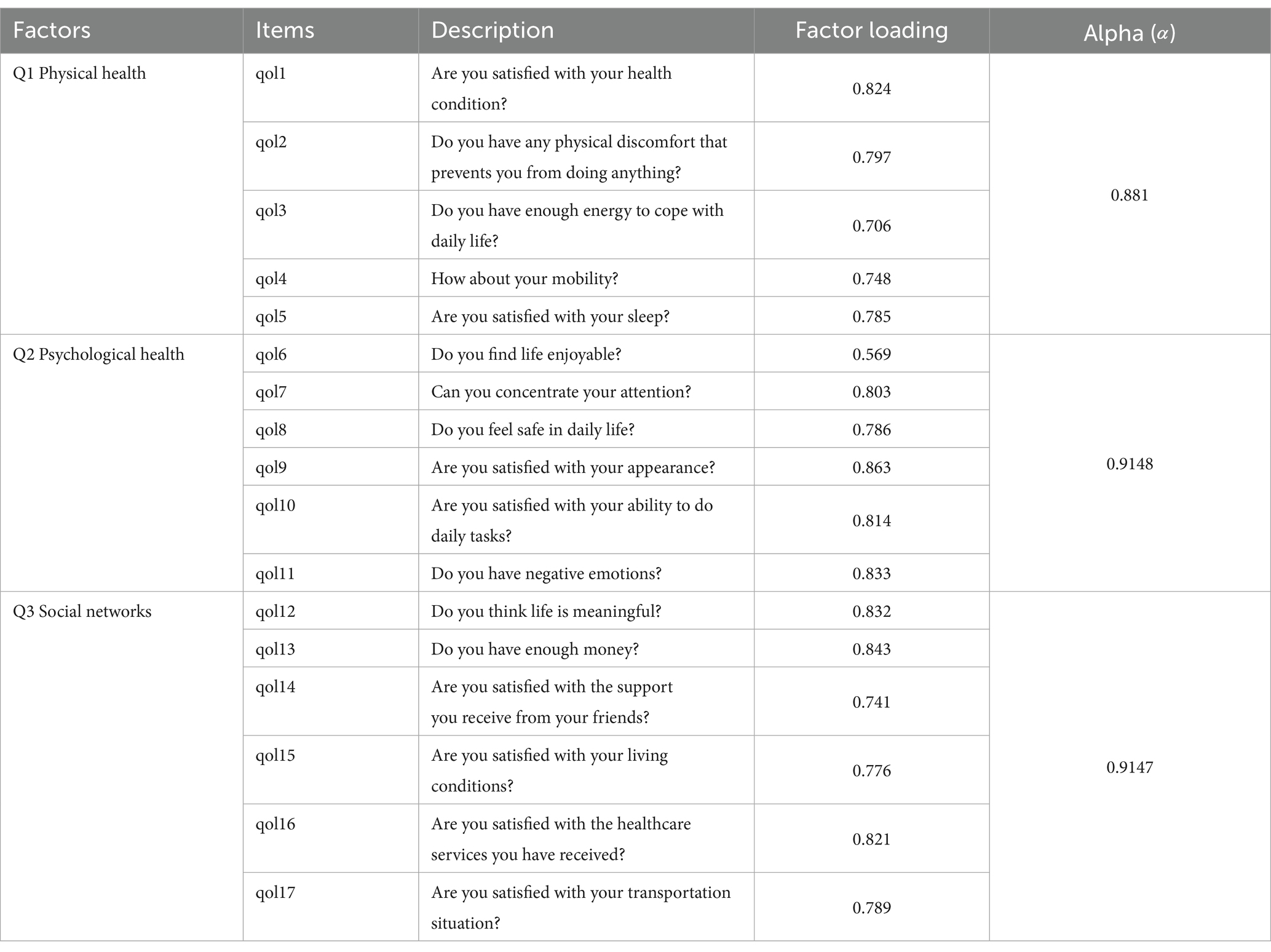 Three QoL factors were identified: physical health (Q1), psychological health (Q2), and social networks (Q3). Each of these QoL factors had a coefficient alpha >0.8, which meant that the factors were reliable, internally consistent, and valid for further analysis. Physical health includes health condition, absence of physical discomfort, energy levels for daily life, mobility, and satisfaction with sleep. Psychological health emphasizes enjoying life, ability to concentrate, feeling safe in daily life, and satisfaction with appearance and ability to perform daily tasks, as well as the absence of negative emotions. The social networks factor includes enjoying life, achieving financial sufficiency, and being satisfied with support from friends, living conditions, healthcare services received, and transportation situation.