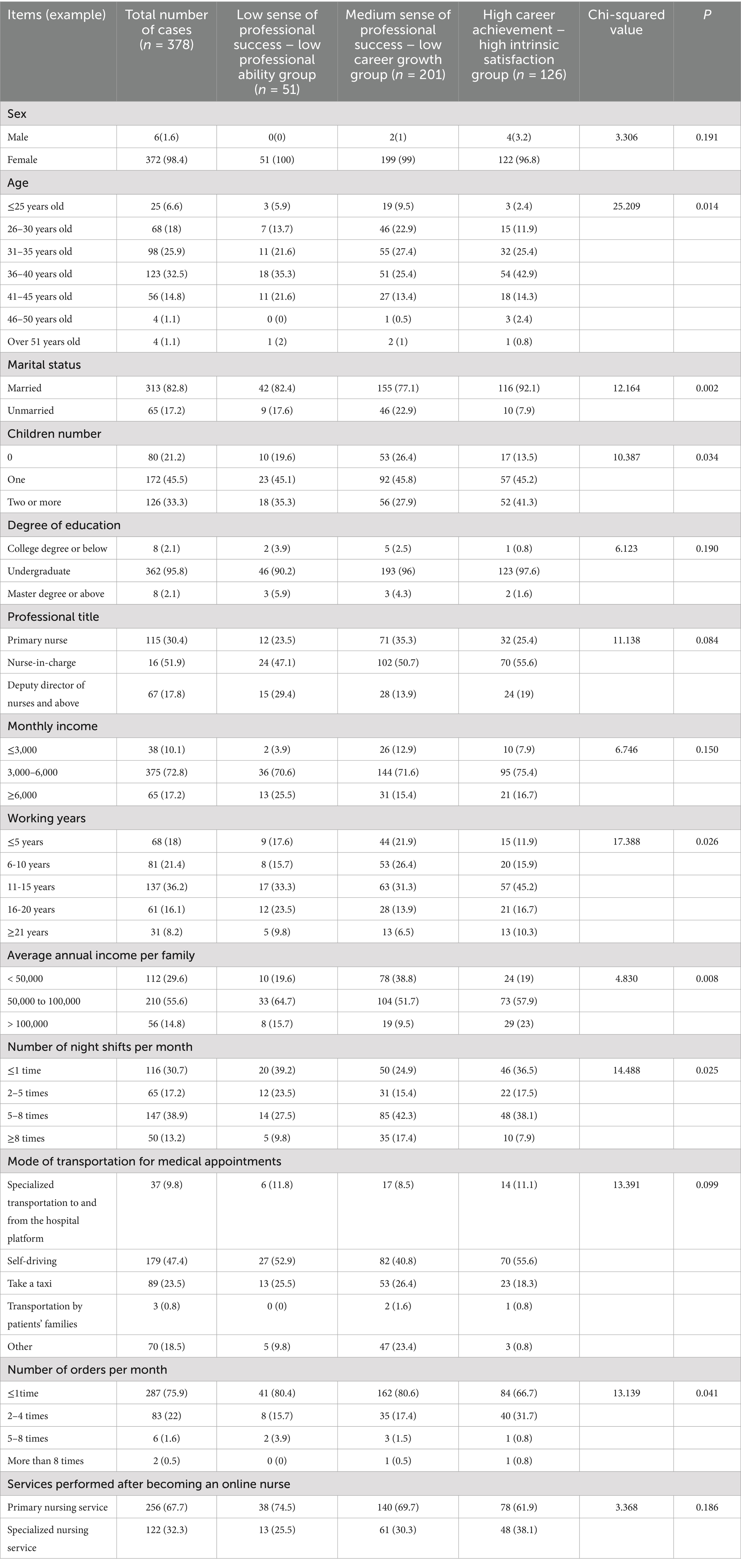 Table 4. Multivariate analysis of the potential profiles of the nurses’ sense of professional success in “Internet + Nursing Services.”