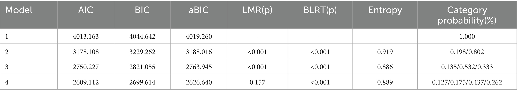 This study used SPSS 26.0 for statistical description and analysis and Mplus 8.3 for latent profile analysis. First, the measurement data that were normally distributed were expressed as mean ± standard deviation, while categorical data were expressed as frequency and percentage. In the second step, we used Mplus 8.3 to conduct latent profile analysis of the nurses’ sense of career success in “Internet + Nursing Services,” starting with a single model and gradually increasing the number of latent profiles. We compared the fit indices of each model, including the Akaike information criterion (AIC), Bayesian information criterion (BIC), and adjusted Bayesian information criterion (aBIC); the smaller the index, the better the fit of the model. The entropy value indicates classification accuracy, with a value of ≥ 0.8 indicating greater precision as it approaches 1. The Lo–Mendell–Rubin adjusted likelihood ratio (LMR) and bootstrapped likelihood ratio test (BLRT) were used to assess differences in model fit, with a p-value of < 0.05 indicating that the model with k profiles outperformed the model with k-1 profiles. The smallest latent profile in the model should have a sample size of at least 5%. In the third step, univariate analysis of nurses’ sense of career success in “Internet + Nursing Services” was conducted using the chi-squared test, and multivariate analysis was performed using unordered multinomial logistic regression, with a p-value of < 0.05 considered statistically significant.