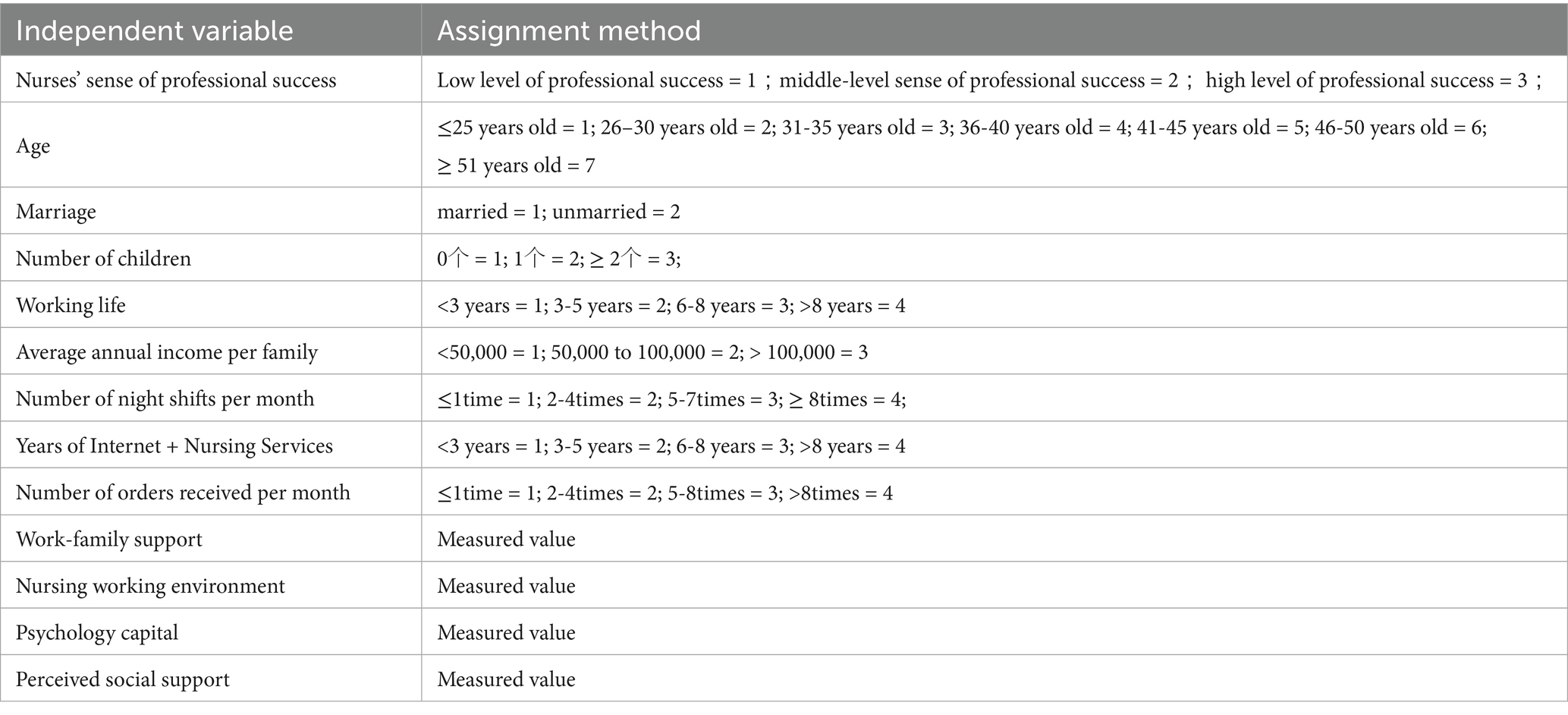 The researchers distributed the questionnaire using the Questionnaire Star platform. Before the survey, the researchers contacted the hospital administrators involved in the “Internet + Nursing Services” in Shanxi Province. The hospital administrators then shared the questionnaire link in the “Internet + Nursing Services” WeChat work group, explaining the inclusion and exclusion criteria to allow eligible participants to fill out the questionnaire. The questionnaire used standardized instructions to explain the research purpose, content, precautions, and confidentiality guidelines. After the questionnaires were collected, two researchers trained in the standardized process reviewed them, eliminating those that were completed in under 5 min or those with consistent or patterned answers.