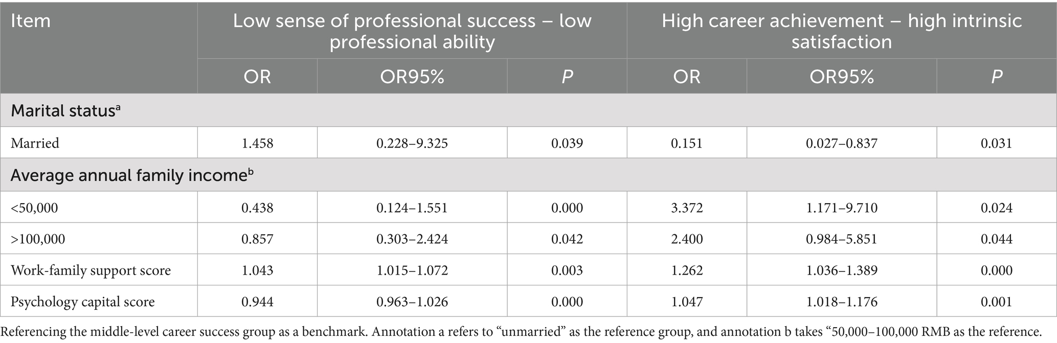 Our research also aimed to explore the factors influencing the sense of professional success among nurses working in “Internet + Nursing Services.” This study found that marital status, average family income, work-family support, and psychological capital are the main factors influencing this group’s professional success. The results indicate that unmarried nurses are more likely to fall into the low professional success group. Professional skills refer to the abilities and techniques required to complete a task, and they also involve the relevant environment and individual motivation (24). Rotter categorizes professional skills into self-competence, professional competence, methodological competence, and social competence (25). Unmarried nurses may be younger, and their self-awareness, planning, and management skills might not have fully developed yet. They tend to have less work experience and weaker professional and problem-solving skills, along with a lack of social experience and communication abilities. In addition, the home care environment is more complicated, and unmarried nurses might experience less financial pressure, leading to lower motivation to participate in “Internet + Nursing Services.” Furthermore, unmarried nurses may be under pressure from societal role expectations, face challenges in maintaining work-life balance, and lack a complete emotional and interpersonal support network, all of which impact how successful they feel in their careers. Therefore, managers should not only focus on enhancing nurses’ professional competence but also guide the career planning of young unmarried nurses, foster problem-solving skills, and improve communication abilities, while being more attentive to their personal lives and offering more emotional support (35).