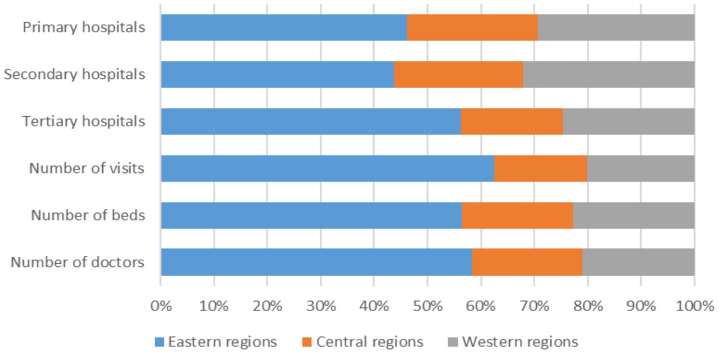 Figure 1. Distribution of medical resources among regions in China. This figure shows the shares of hospitals, medical personnel, and patient visits in eastern (blue), central (orange), and western (gray) regions. The eastern region accounts for about 55% of tertiary hospitals, 60% of beds and physicians, and nearly 65% of total patient visits, indicating a strong concentration of advanced medical resources, whereas central and western regions lag significantly behind in these dimensions.