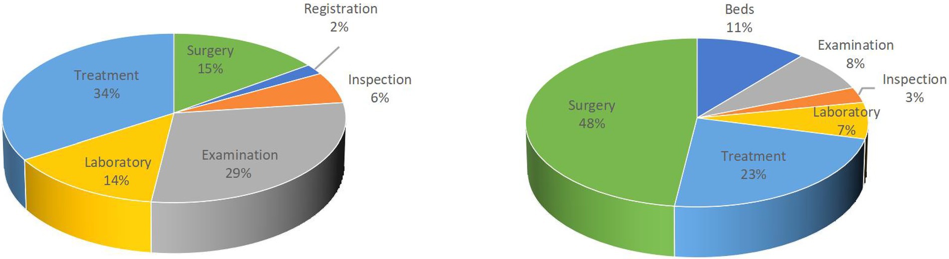 Figure 2. Breakdown of outpatient and inpatient expenditure per visit in China. The left figure shows outpatient expenditure, dominated by treatment (34%) and examinations (29%), with surgery and laboratory services accounting for smaller shares. The right figure shows inpatient expenditure, where surgery makes up nearly half of total costs (48%), followed by treatment (23%) and bed charges (11%). Percentages indicate the share of each item in total outpatient or inpatient expenditure.