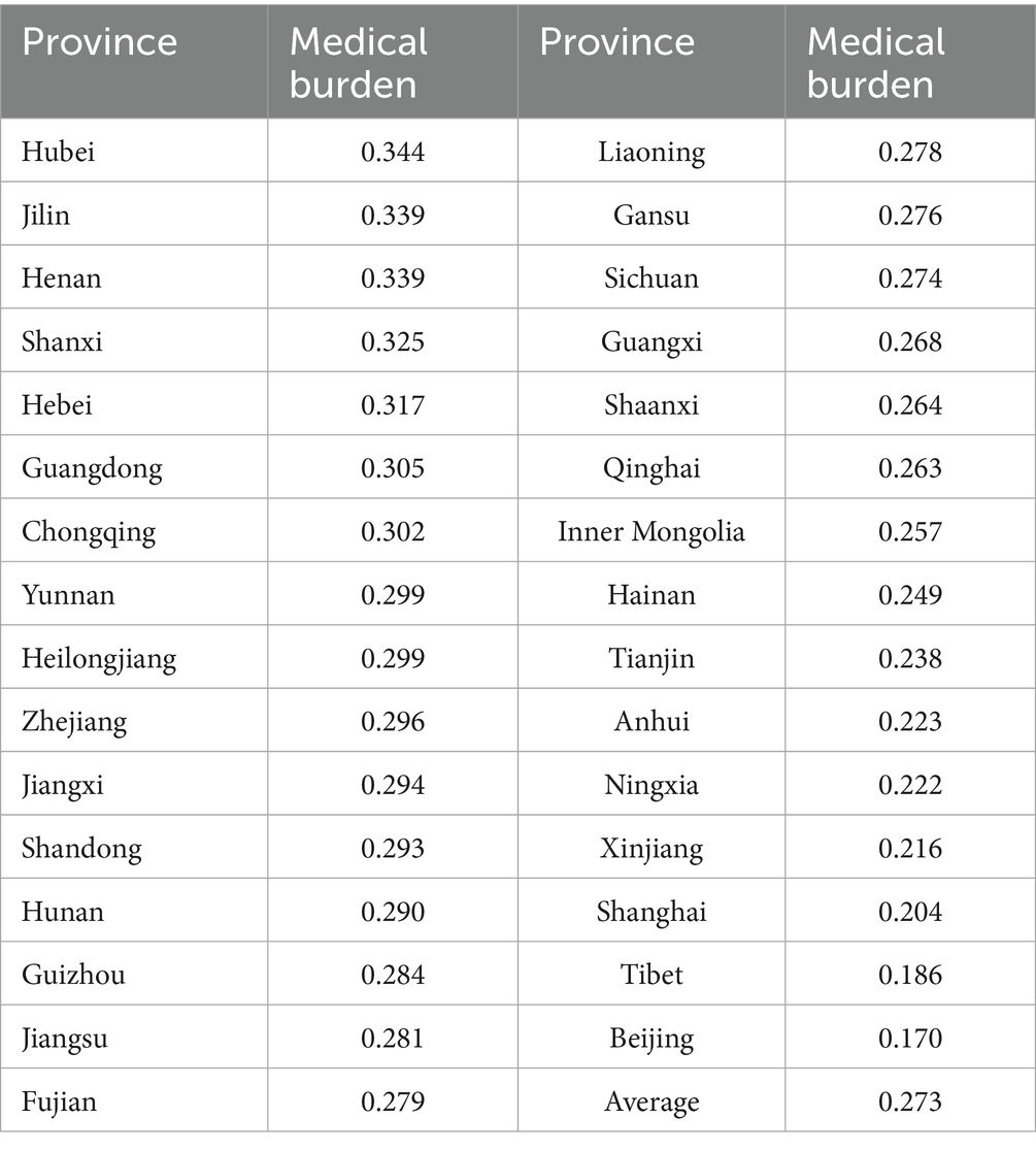 Table 1 shows the provincial medical burden faced by low-income groups measured as the ratio of average medical expenditure to the local minimum wage. The national average stands at 27.3%, indicating that nearly a third of minimum wage income is allocated to medical care. Hubei Province bears the heaviest burden, with medical expenses accounting for 34.4% of the minimum wage, while Beijing, though the lowest among all regions, still exceeds 15%. These figures underscore the persistent affordability challenges in China’s healthcare system.