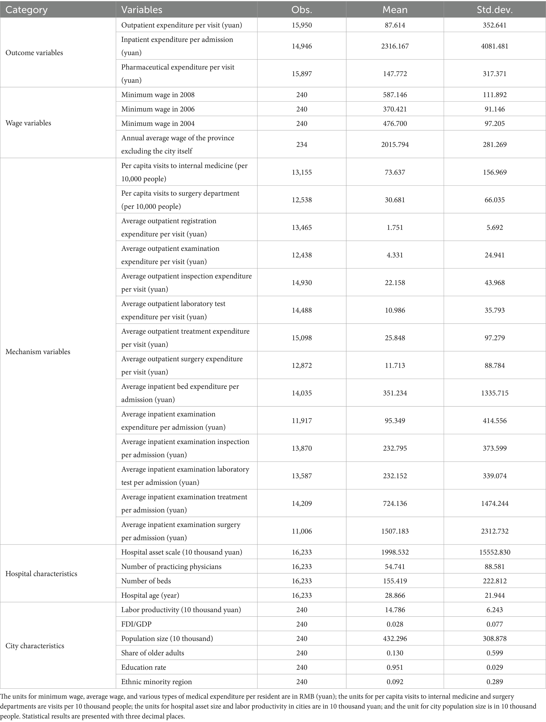This paper addresses a gap in the existing literature by systematically assessing the impact of local minimum wages in China on residents’ medical expenditures, healthcare utilization, and willingness to seek care. China’s long-standing regional disparities in economic development and healthcare resources (8, 9), together with substantial cross-regional variation in minimum wage levels and enforcement, create a natural setting for this analysis. The coexistence of a hierarchical medical system and an urban–rural dual structure further provides a unique context to identify heterogeneous effects and policy transmission mechanisms.