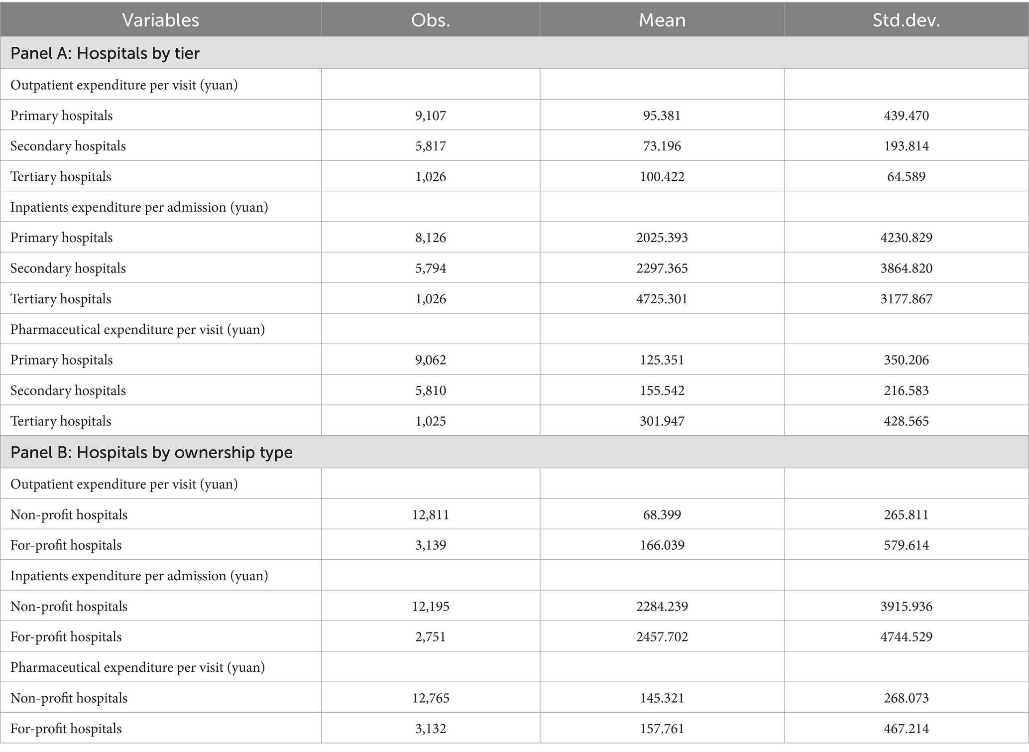 Panel B shows that for-profit hospitals account for roughly one-fifth of all hospitals in the dataset. Across all categories—outpatient, inpatient, and pharmaceutical—average expenditures are consistently higher in for-profit hospitals compared to their nonprofit counterparts. This pattern is consistent with institutional arrangements in China’s healthcare system, where public non-profit hospitals operate under government-administered fee schedules and fiscal subsidies, while for-profit hospitals retain greater autonomy to set market-based prices and are often excluded from public insurance reimbursement.
