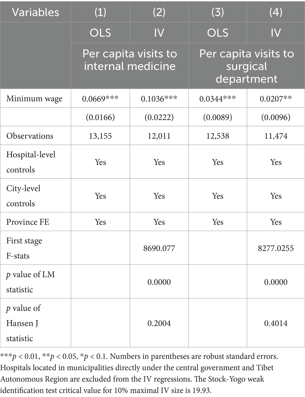 To empirically test this mechanism, we rely on patterns of utilization across medical departments. Although the dataset does not contain disease-specific expenditure information, the categorization of patient visits by clinical department provides a useful proxy. In China, hospitals are broadlly categorized into internal medicine and surgery. Internal medicine primarily treats chronic illnesses requiring prolonged care and symptom management, such as cerebrovascular diseases, cancer, respiratory conditions, and cardiovascular diseases—all leading causes of death in China (12, 26). By contrast, surgical departments mainly treat acute conditions that are curable in the short term through operative procedures, including orthopedic cases (e.g., fractures) and neurosurgical emergencies (e.g., traumatic brain injuries). While detailed revenue data by department are unavailable, the dataset includes the number of patient visits by department, providing a feasible strategy to examine whether minimum wage policies influence healthcare utilization for chronic conditions.