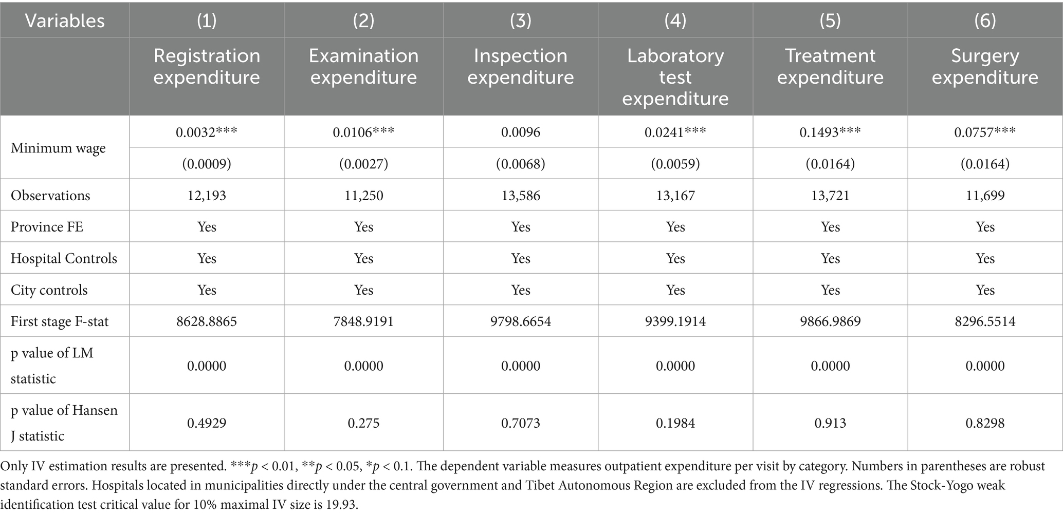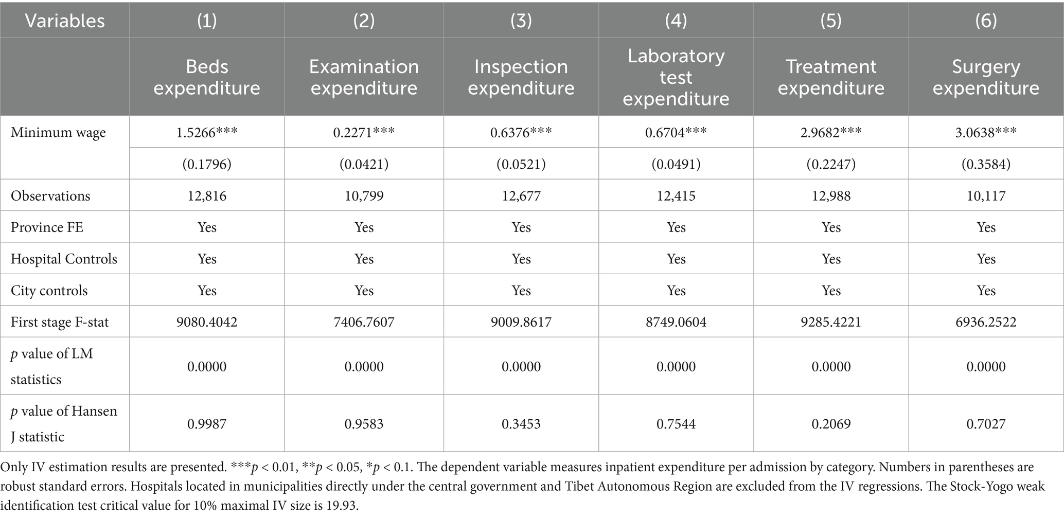 Table 6 presents the IV-2SLS estimation results for inpatient expenditures by categories. The effects are positive and statistically significant across all items, but the largest coefficients are concentrated in treatment and surgery (Columns 5 and 6), where a one-yuan increase in the minimum wage raises spending by 2.97 yuan and 3.06 yuan, respectively. This confirms that wage gains translate most strongly into utilization of the costliest inpatient services.