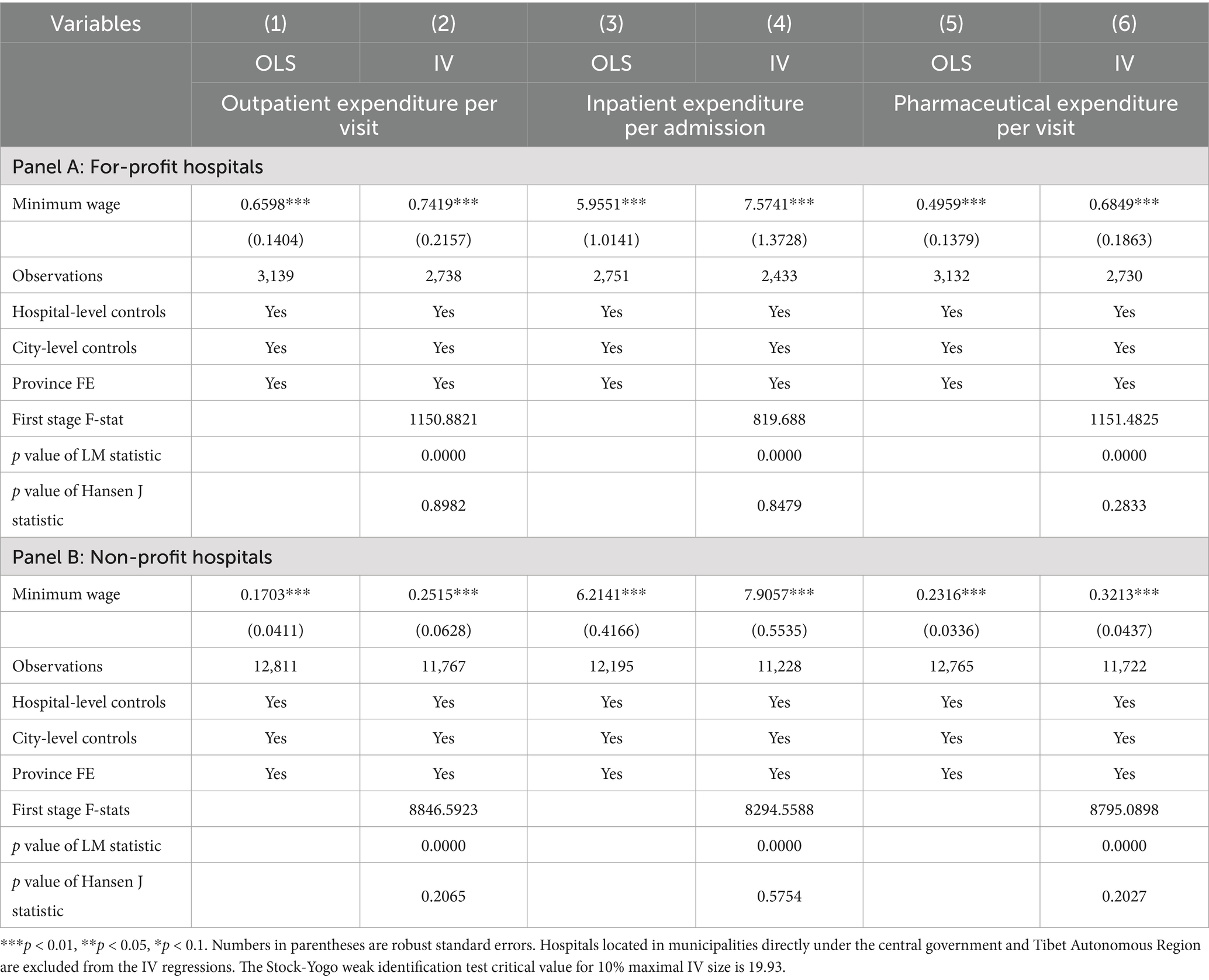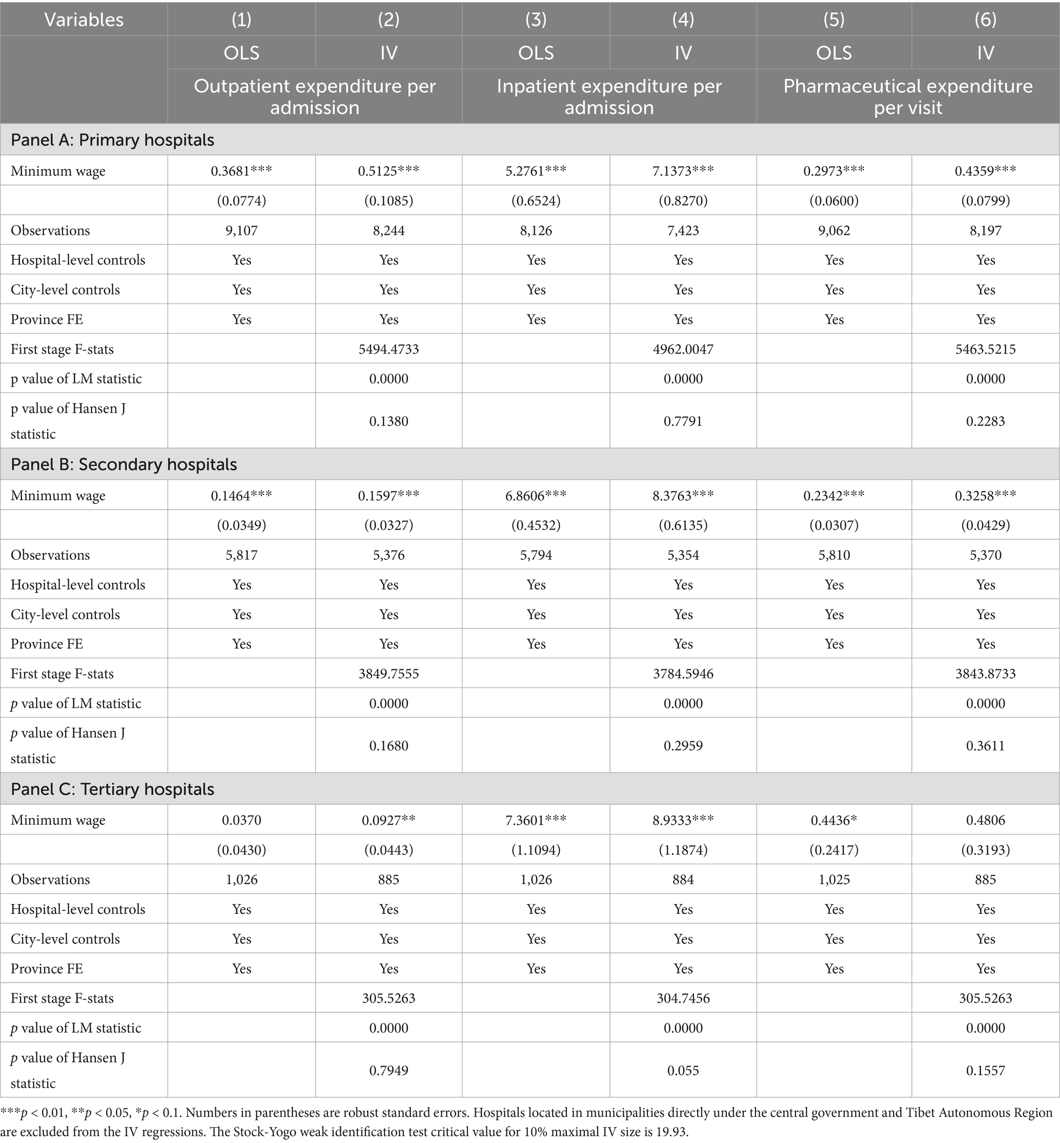 Table 4 presents the main results with province fixed effects. Column (1) reports the OLS estimates from Equation (1), controlling for a range of hospital and city characteristics as well as province fixed effects. The estimate show a statistically significant association between the minimum wage and outpatient expenditure per visit. To address potential endogeneity, Column (2) reports the IV-2SLS estimates. The coefficient increases in magnitude and remains statistically significant at the 1% level, indicating that OLS may underestimate the effect.