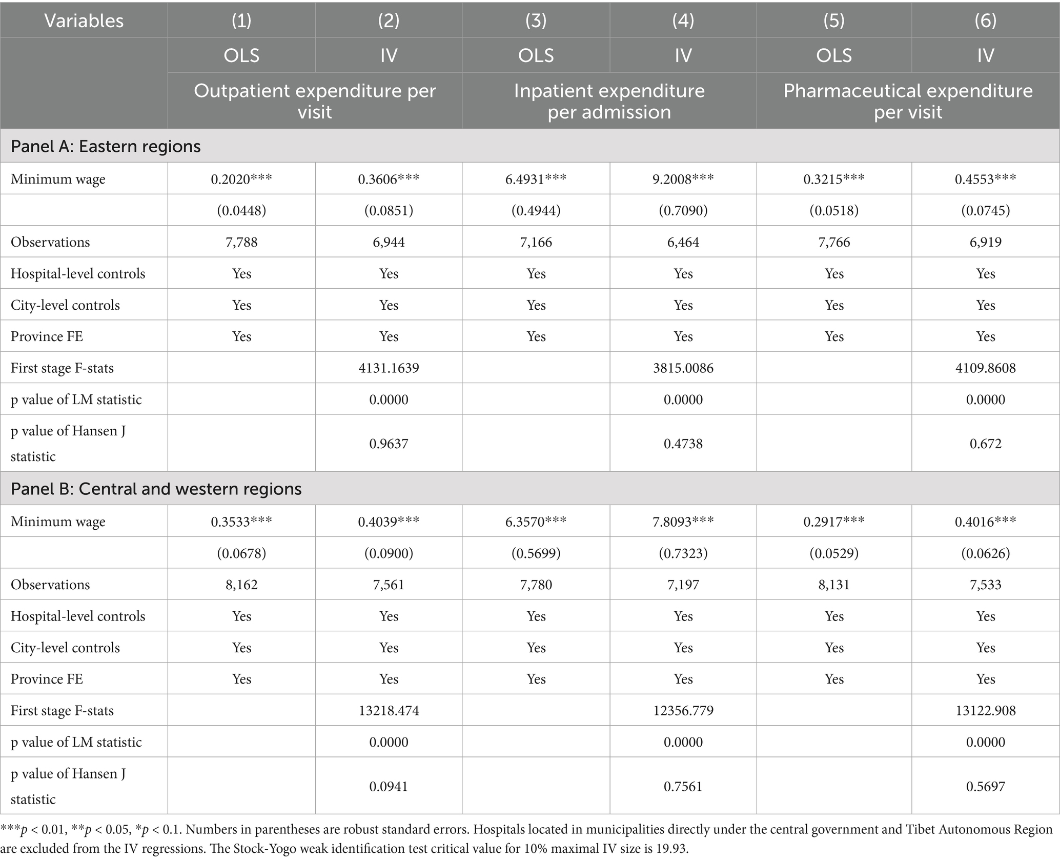 Based on this logic, we construct two IVs. The first IV (IV1) is the regional minimum wage level in 2004—the first year of nationwide enforcement of the Minimum Wage Regulation16—following Mayneris et al. (20). IV1 reflects historical wage-setting practices shaped by early labor market structures and administrative capacity, and is strongly correlated with subsequent minimum wage adjustments. Its temporal separation from the outcome period also makes it unlikely to be influenced by contemporaneous healthcare behaviors or expenditures, thereby supporting both the relevance and exogeneity conditions required for a valid instrument.