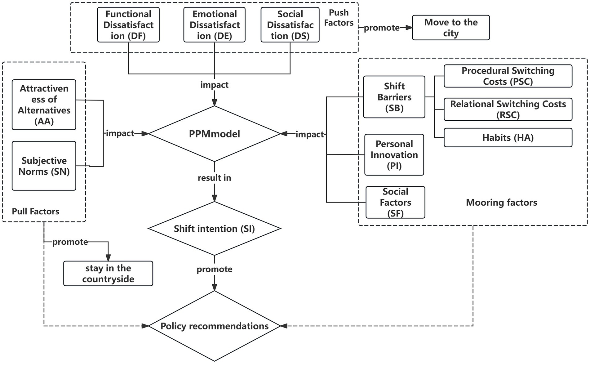 Given the complexity of transfer behaviours, a single push-pull theory cannot fully explain individual shift intentions and decision-making processes. Factors such as individual behaviour, cultural background or social environment may also facilitate or hinder shift intention and decision-making, which corresponds to the anchoring factors in the PPM model, e.g., elements such as shift barriers and personal innovation may play a role in an individual’s shift intention. Adaptation to urban life and the cost of living to be borne in the countryside may weaken individuals’ motivation to move. In addition, personal attributes such as the increasing quality of urban healthcare services, the widening gap between urban and rural healthcare services, personal innovation preferences and past experiences may also play a role in fixing transfer behaviour. Therefore, this study included shift barriers, personal innovation and social factors in the examination of anchoring factors.