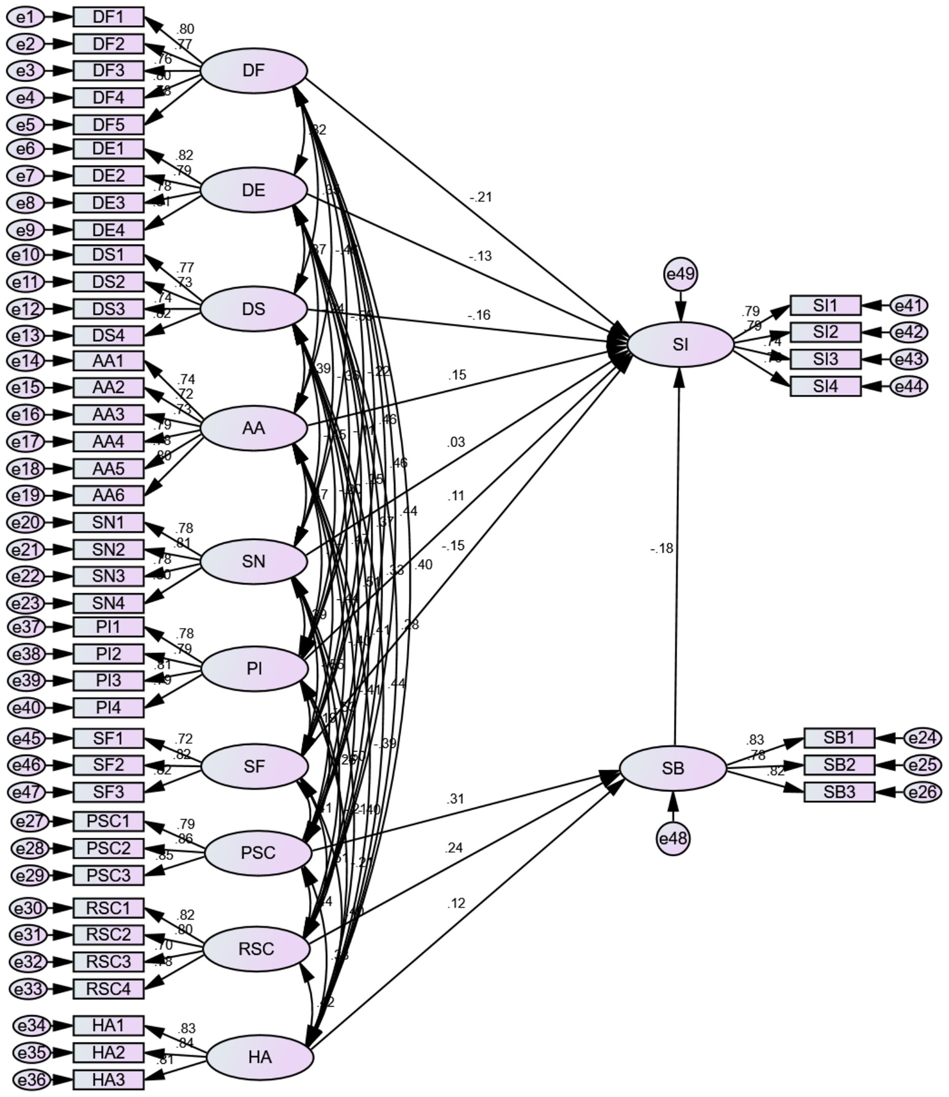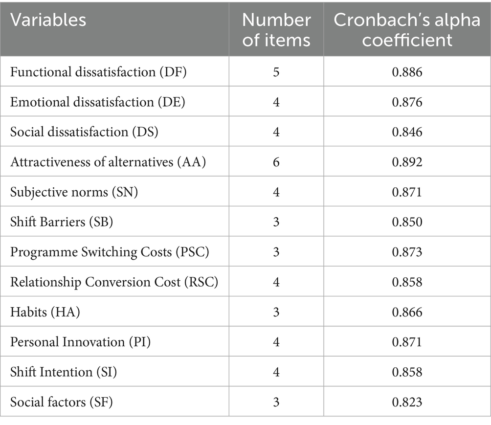 Table 4 Cronbach’s alpha coefficient was used to assess the internal consistency of the questionnaire, and the results showed that the alpha coefficients of the 12 core variables were higher than 0.7 (range 0.823–0.892), which meets the acceptable standard of reliability for social science research. Among them, the alpha coefficient of “attractiveness of alternative choices” (AA) reaches 0.892, indicating a high degree of consistency among the six items; the lowest one, “social factors” (SF), is also 0.823, which verifies the overall stability of the research instrument. This table provides a reliable reliability support for the subsequent structural equation modelling analysis.