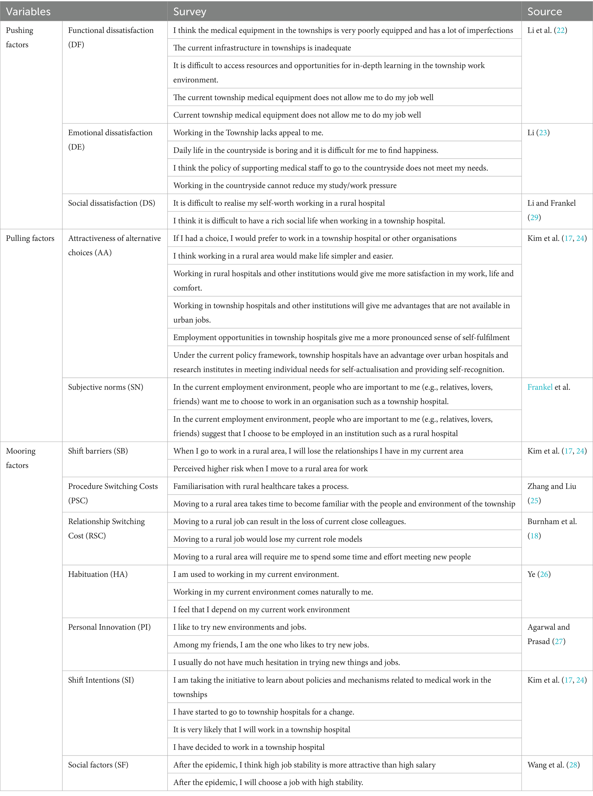 In addition to the dissatisfaction of medical personnel with the overall environment of rural healthcare, factors such as the support of relevant policies and the relatively weak competitiveness of rural healthcare positions will also lead to the intention of medical personnel to transfer. Research by Li (16) and others has already shown that, in the context of market competition, the introduction of public investment and major projects will trigger the shift intention of talents and create an employment transfer effect. In addition, perceptions of social groups (e.g., family, lovers, friends, etc.) can also have an impact on medical personnel’s shift intention employment due to factors such as family responsibilities and kinship. Therefore, this study examines the attractiveness of alternatives and subjective norms as part of pull factors.