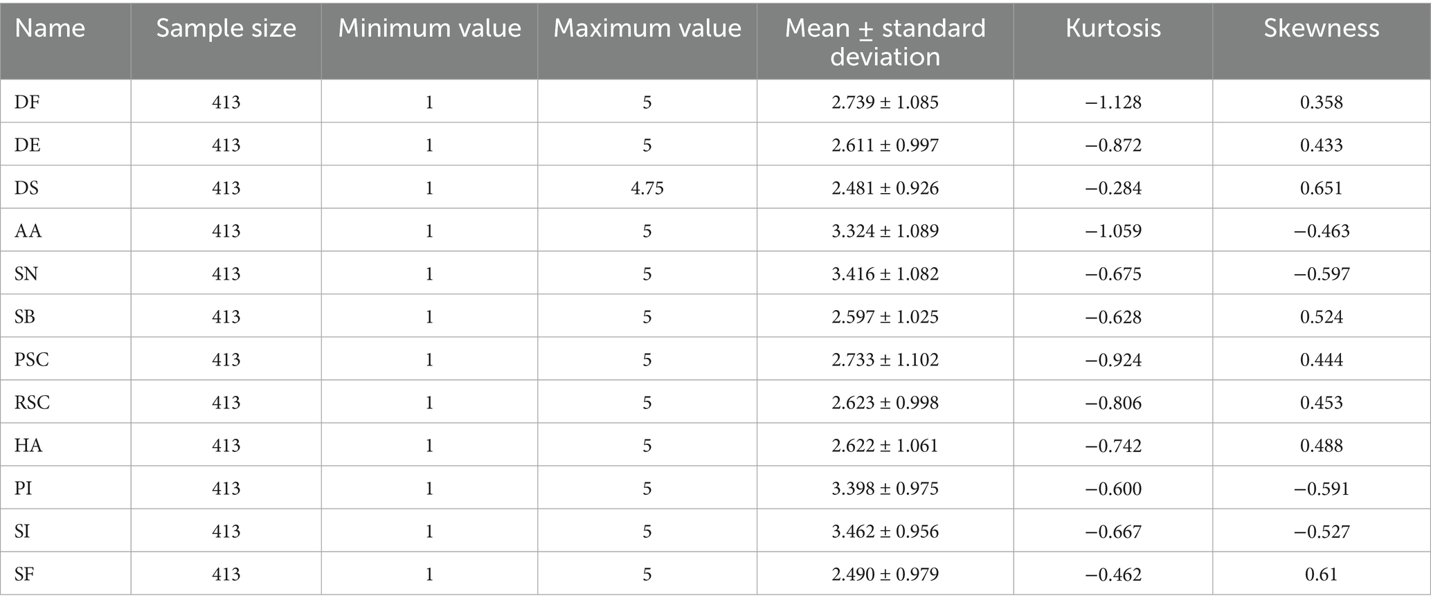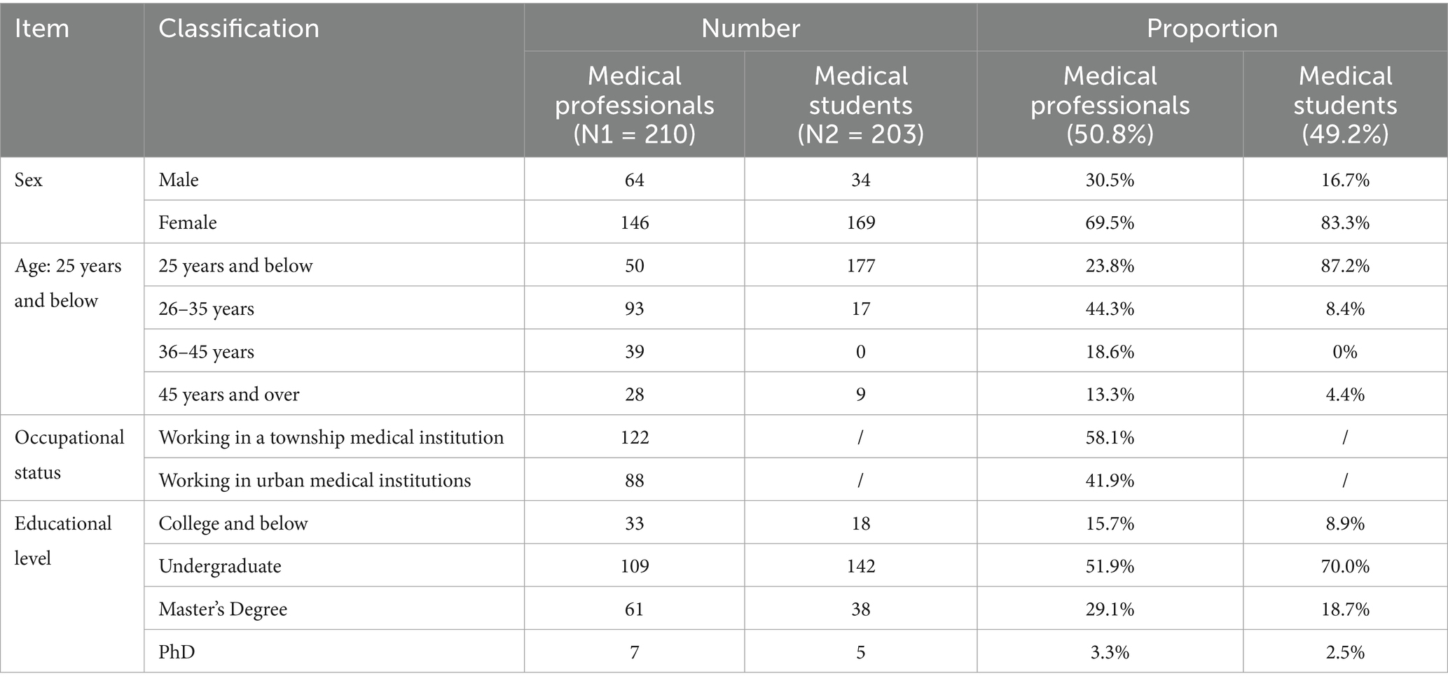 This study was conducted by “online + offline” survey, a total of 430 questionnaires were distributed, and finally 413 valid questionnaires were recovered, with a recovery rate of about 96%, of which 210 were for medical professionals and 203 were for medical students, as shown in the statistical description of the sample in Table 2. There were 98 males, accounting for 23.7%, and 315 females, accounting for 76.3%. The age and occupational status of the sample showed that medical professionals were proportionately more balanced in age distribution and occupational status distribution, and medical students were mostly under 25 years old. In terms of educational attainment, 87.7% had a bachelor’s degree or higher, so representation in the wider population may be more limited.