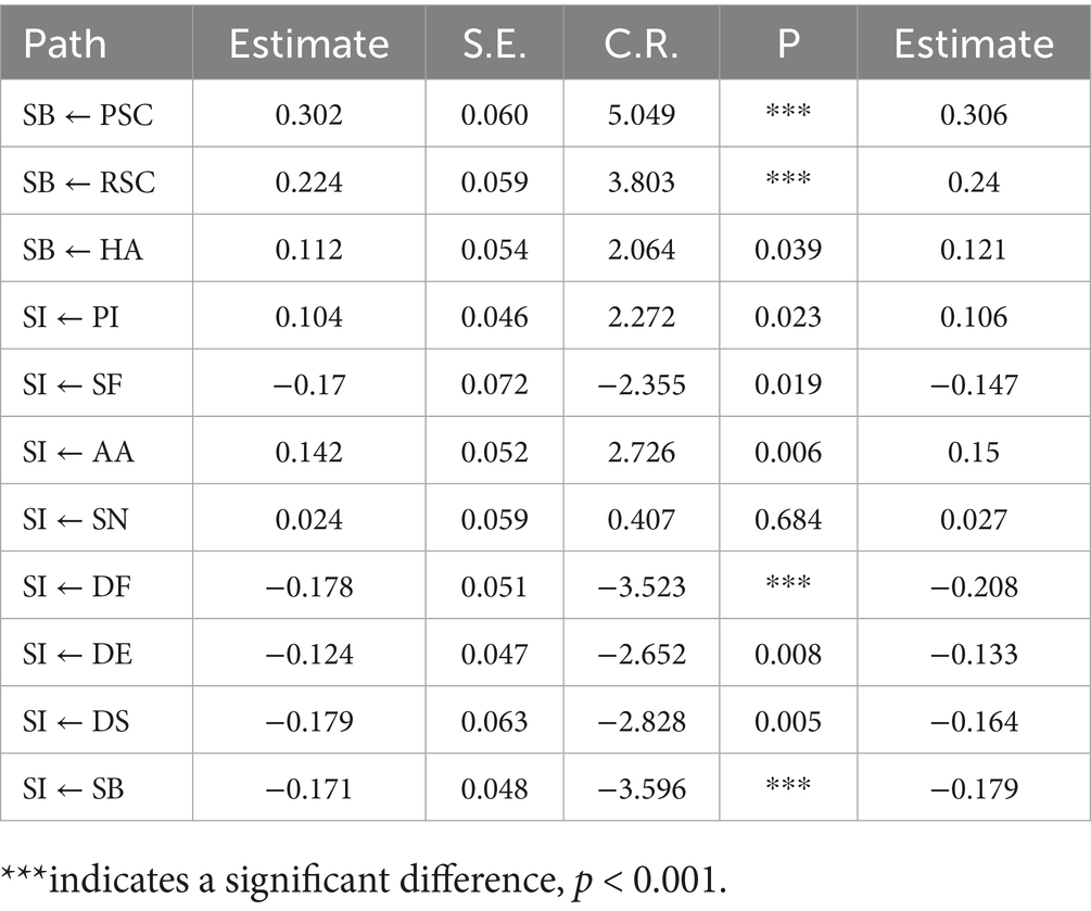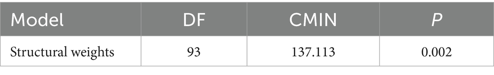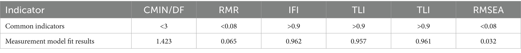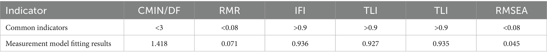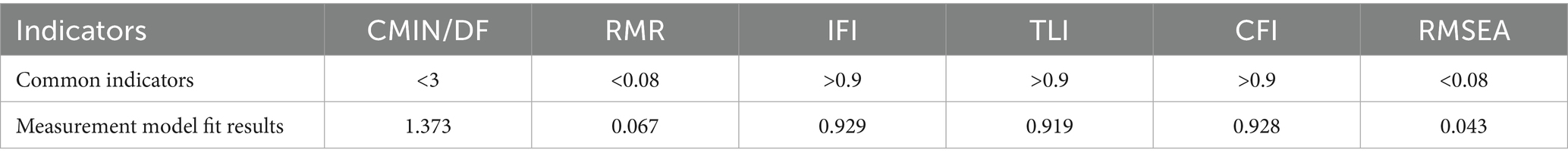 Table 7 shows Composite reliability and the convergent validity. Composite reliability (CR) is one of the criteria for assessing the internal quality of the model, reflecting whether all items under each latent variable consistently explain that latent construct. IFCR≥0.70, generally considered to indicate good reliability (19, 20), IF 0.60 ≤ CR < 0.70, it can be acceptable in exploratory or early-stage research; if CR < 0.60, it means indicates insufficient internal consistency of the latent construct, suggesting that items with low factor loadings should be removed or the model should be re-specified. As shown in Table 7, all CR values exceed 0.7, indicating that the items within each latent variable consistently account for the corresponding construct. The convergent validity of each dimension is reflected by the average variance extracted (AVE), which is commonly used to evaluate the convergent validity of a scale. AVE directly shows the proportion of variance in the observed variables explained by the latent construct relative to measurement error. A higher AVE value indicates that a greater proportion of variance is explained by the latent construct, while measurement error is relatively lower. Conventionally, a threshold of 0.5 is considered acceptable. As shown in Table 7, all AVE values exceed 0.5. These results demonstrate that the questionnaire’s structural model possesses good convergent validity.