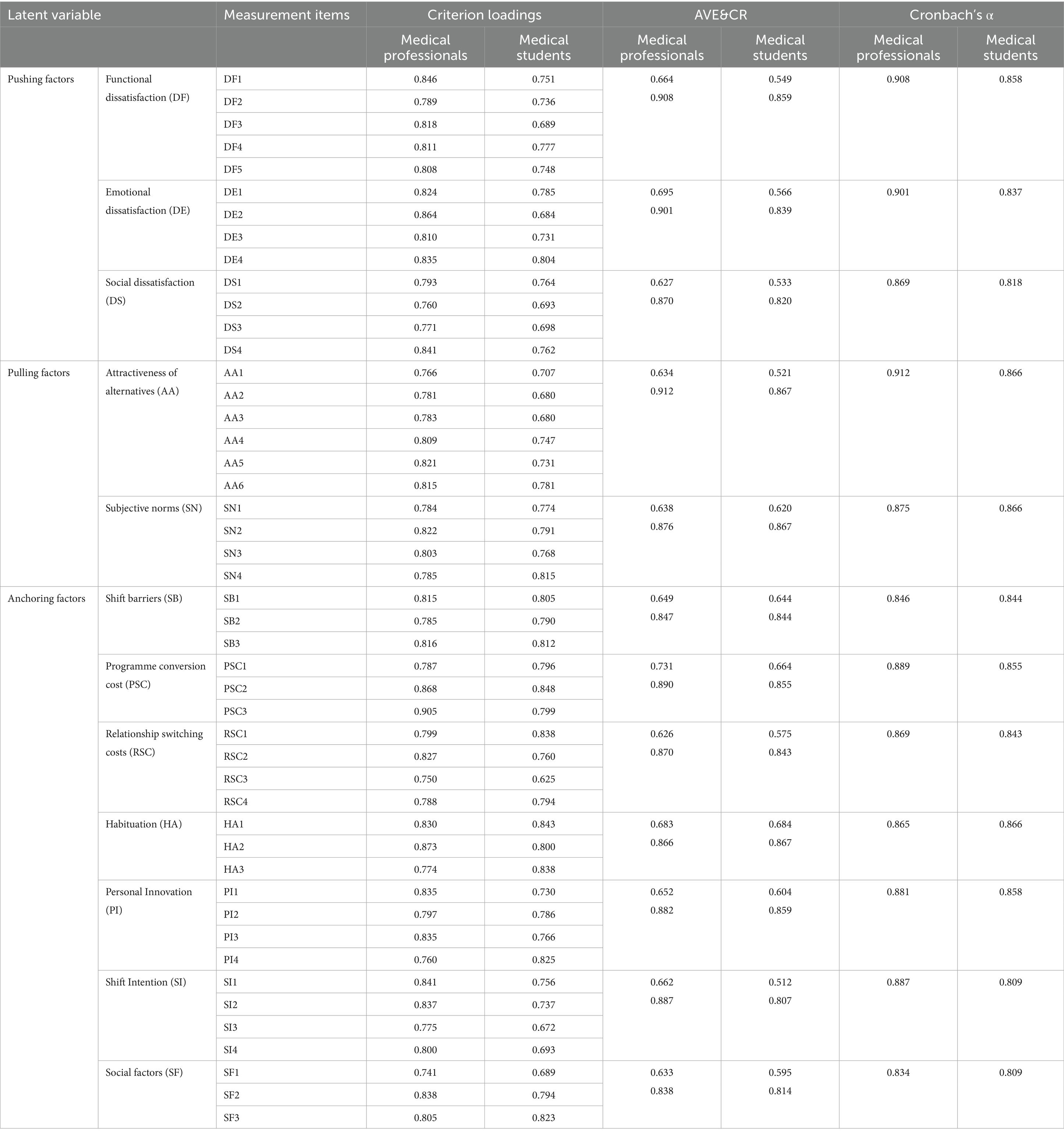 The test results for the sample of medical professionals showed that the combined reliability (CR) of all latent variables was significantly higher than 0.8 (range 0.838–0.912), with CR values of 0.838 for “Social factors” (SF) and 0.912 for “Attractiveness of Alternatives” (AA), which indicated that the items had a strong consistency in explaining the latent variables; the average variance extraction (AVE) was higher than 0.6 (range 0.626–0.731), with AVE = 0.626 as the minimum value for “Relationship switching costs “(RSC) and AVE = 0.731 as the maximum value for “Programme Conversion Cost” (PSC), which indicates that the control of measurement error is excellent; for example, the standardised factor loadings of “functional dissatisfaction” (DF) were all higher than 0.7 (range 0.789–0.846, p < 0.001), and the aggregation of measurement items is significantly better than that of the medical student group, providing a robust measurement basis for cross-group comparison.