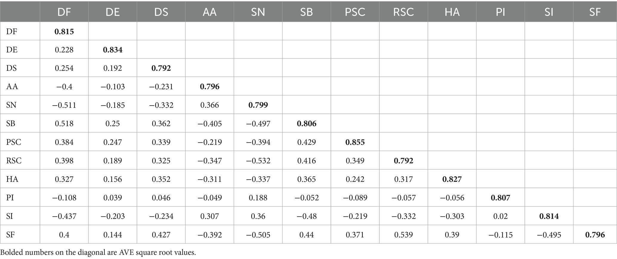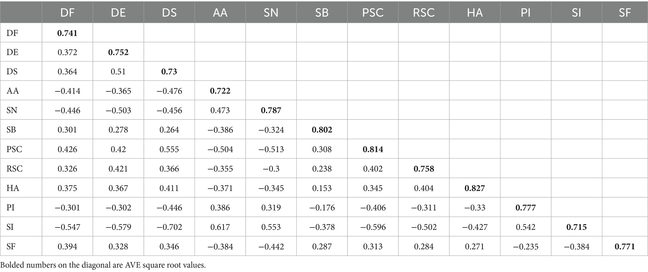 In the present analysis, the square roots of the AVE values for all constructs exceeded the absolute values of the inter-construct correlations, indicating good discriminant validity.