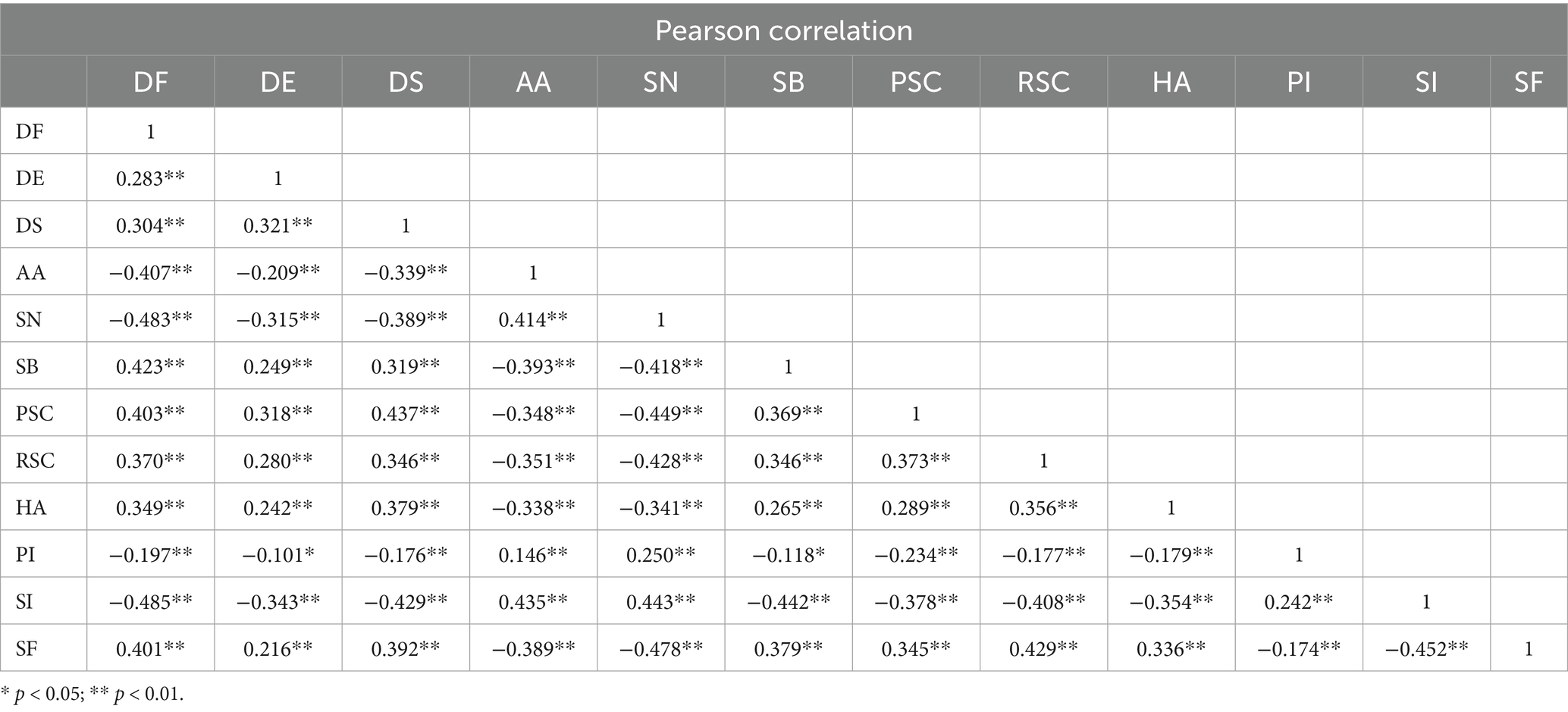 Analysing the relationship between shift intention (SI) and the other 11 variables by Pearson’s correlation coefficient (Table 10), we found that SI was significantly negatively correlated with functional dissatisfaction (DF), emotional dissatisfaction (DE), and social dissatisfaction (DS) (r = −0.485 to −0.429, p < 0.01), suggesting that service deficiencies inhibit the intention to shift; and was significantly positively correlated with the attractiveness of the alternative choice (AA) and subjective norms (SN) were significantly positively correlated (r = 0.435 ~ 0.443, p < 0.01), suggesting that external opportunities and social acceptance promote transfer behaviour; meanwhile, SI was significantly negatively correlated with shift barriers (SB), procedural switching costs (PSC), relational switching costs (RSC), and habits (HA) (r = −0.442 ~ −0.354, p < 0.01), reflecting the hindering effect of cost and inertia on transfer; while the positive correlation between personal innovation (PI) and SI (r = 0.242, p < 0.01) and the negative correlation between social factors (SF) and SI (r = −0.452, p < 0.01) further reveal the differential effects of psychological traits and environmental pressures on transfer decisions.