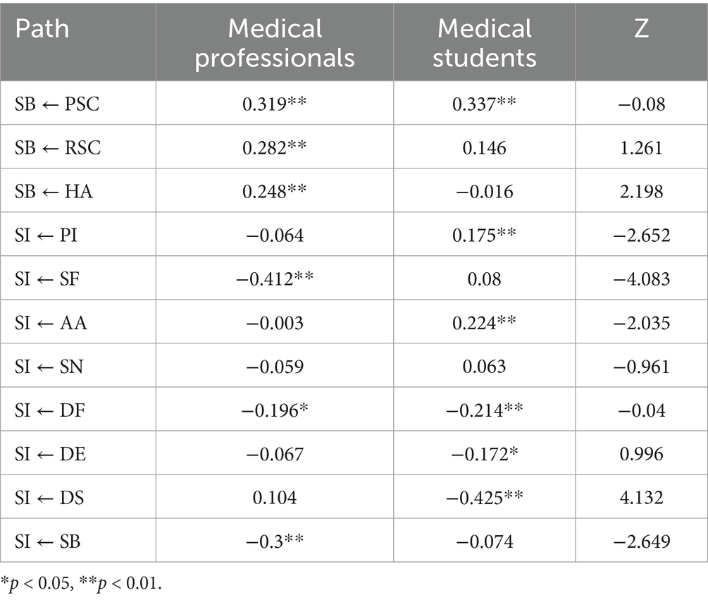 The specific differences can be seen in Table 14. The Z-values were calculated for medical professionals and medical students in “HA → SB” “PI→SI”“SF → SI”“AA→SI ““DS → SI,” and “SB → SI” paths were significantly different (Z > 1.96). Multi-cluster analyses showed significant differences in the strength of critical path influence between the medical professionals and medical student groups: the negative influence of social factors (SF) on shift intention (SI) was much stronger for the professional staff (β = −0.412) than for the medical students (β = 0.08), while the medical student group’s positive effect of personal innovation (PI) on SI (β = 0.175) was significantly higher than that of medical professionals (β = −0.064); furthermore, medical professionals’ sensitivity to functional dissatisfaction (DF) (β = −0.196) was also higher than that of medical students (β = −0.214) suggesting that occupational experience reinforces social normative constraints and pragmatic orientations, whereas the medical student population relies more on innovative traits to drive transfer decisions.