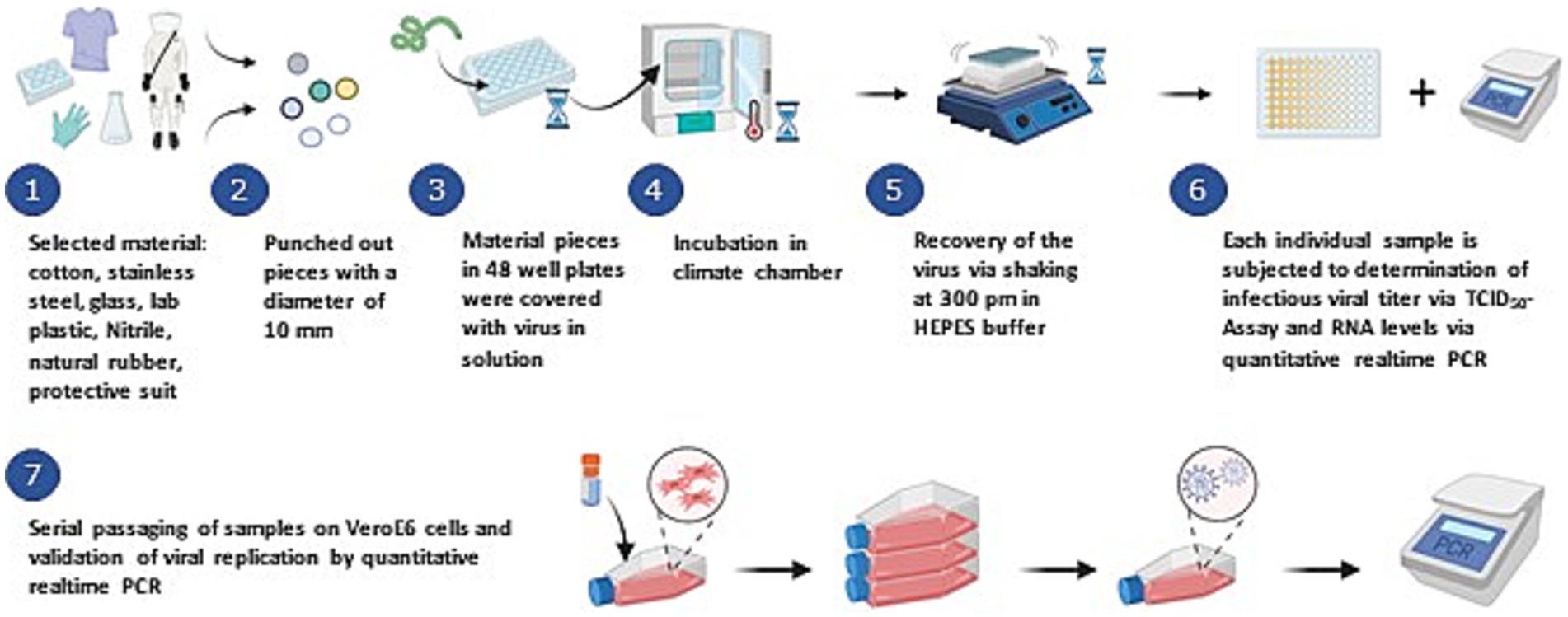 Figure 1. Schematic depiction of the complete workflow of the testing approach. Steps 1–6 represent the general approach to evaluate the viral particle stability and infection retention on the indicated testing material under two distinct environmental conditions. Step 7 further describes the validation of the stability analyses results using serial passaging on VeroE6 cells to facilitate viral propagation of any particle which might still be infectious as a second analysis checkpoint. Created with Biorender.com.