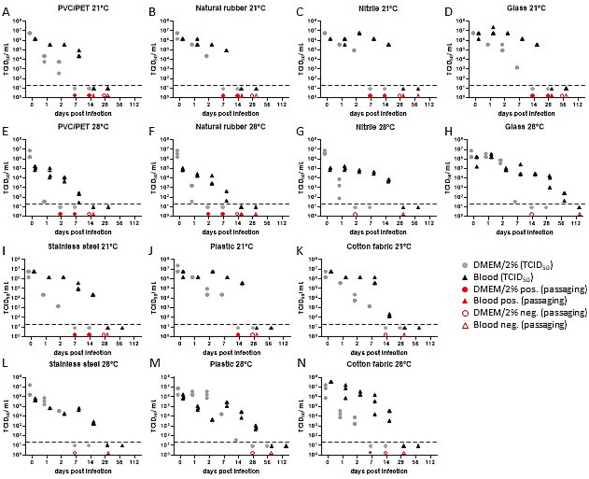 Figure 2. Virus titer determined by the TCID50 assay for EBOV-GFP under indicated conditions (A–N). Gray and black filled symbols represent the individual samples taken in triplicates at each time point. TCID50 assay sensitivity cut-off is marked as dotted line. Sample points below were tested negative in the TCID50 assay. Red symbols indicate data points which showed either active viral replication (filled) or no viral replication (empty) (DMEM/2% = DMEM supplemented with 2% FCS, blood = serum-cleared sheep blood).