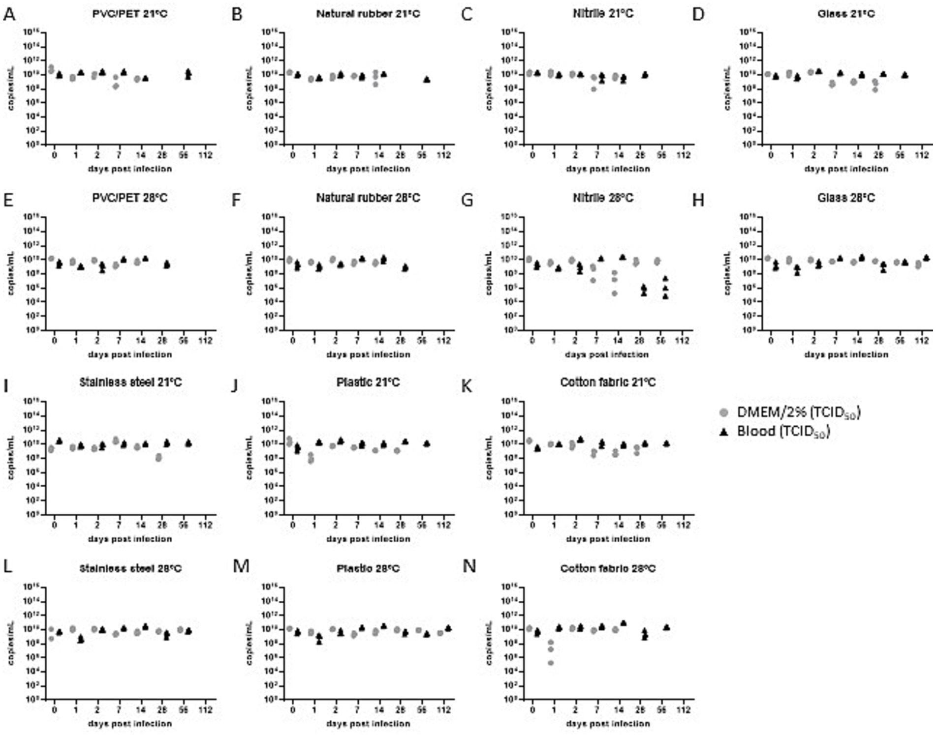 SUPPLEMENTARY FIGURE S1 | Viral RNA is recovered from the test material through the entire measuring time range (0-112 days) independently from the incubation conditions. Shown are the calculated genome equivalents per initial viral stock volume (copies per mL) placed onto the respective material at indicated conditions based on quantitative real-time PCR data specific to EBOV-GFP (A–N). Symbols represent the individual samples taken in triplicates at each time point (DMEM/2% = DMEM supplemented with 2% FCS, blood = serum-cleared sheep blood).