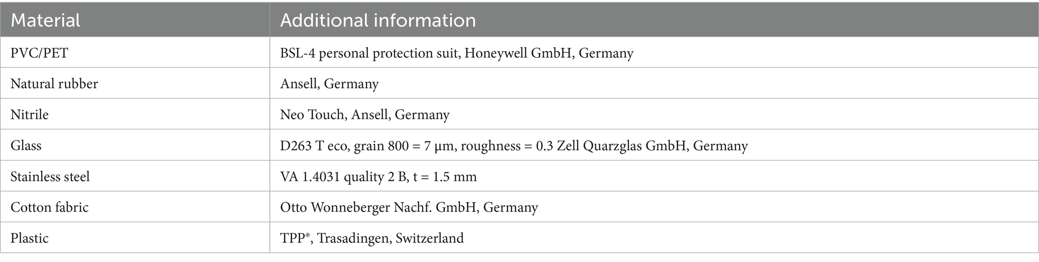 From each individual material discs with a diameter of 10 mm were punched out. The direct usage of the plastic ground of 48-well plate dishes to mimic plastic surface is the only exception to this procedure. The distinct material discs were placed into a 48-well plate (TPP®; TPP92448). Considering the guidelines and procedures of the German Association for the Control of Viral Diseases (Deutsche Vereinigung zur Bekämpfung der Viruskrankheiten e. V., DVV) (19), two different testing solutions mimicking contamination were used: (1) DMEM/2% or (2) serum-cleared sheep blood in a 1:1 ratio.