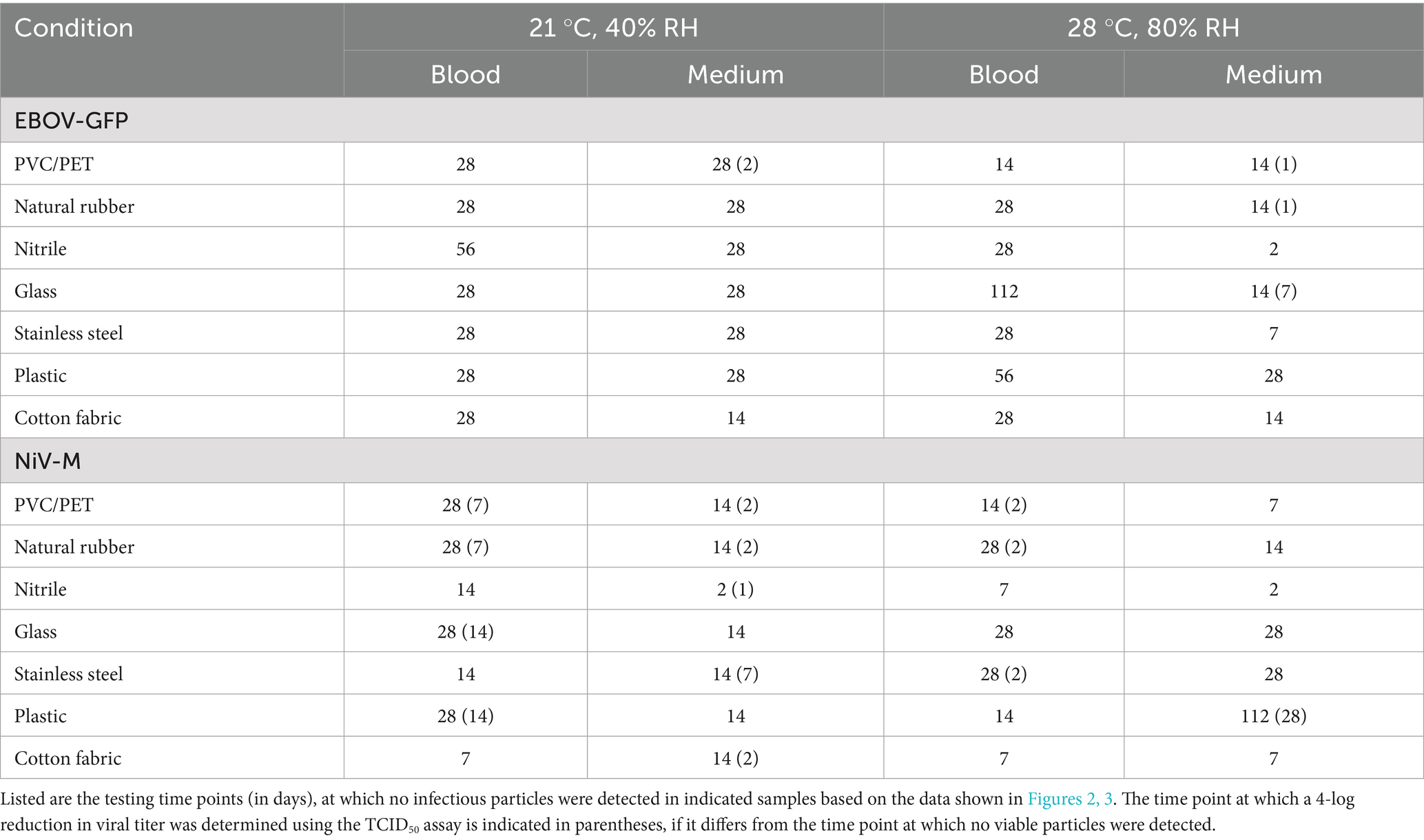Our investigation of the infectivity of viral particles uncovered a gradual reliance on surface characteristics, as well as temperature and humidity variables (Table 2). Within the specified temperature and relative humidity parameters, our results show an absence of detectable infectious EBOV or NiV-M virus particles on the examined material between day 2 and day 112 depending on surface material and environmental condition. As determined by our analyzed timeline the median retention time ranges between 14 and 28 days. This underscores the intricate interplay between environmental conditions and viral persistence, highlighting the importance of understanding these factors in the context of viral transmission and control.